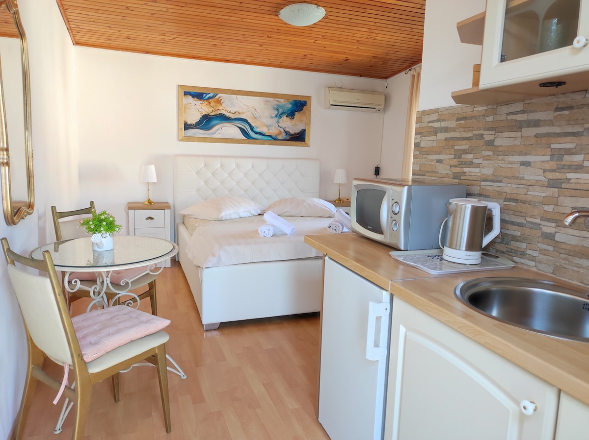 Acogedor estudio con impresionantes vistas al mar con terraza compartida. Ubicado junto a la playa, a solo 2 km de Trogir, este pequeño pero totalmente equipado estudio es una base ideal para tus vacaciones en el centro de Dalmacia. Una hermosa playa de guijarros está justo al otro lado de la calle, a solo unos pasos. La terraza se comparte entre dos estudios, con un área designada frente a cada uno para uso privado. Ten en cuenta que durante la temporada alta, el estacionamiento en la calle puede ser difícil de encontrar, incluso más lejos de la casa.