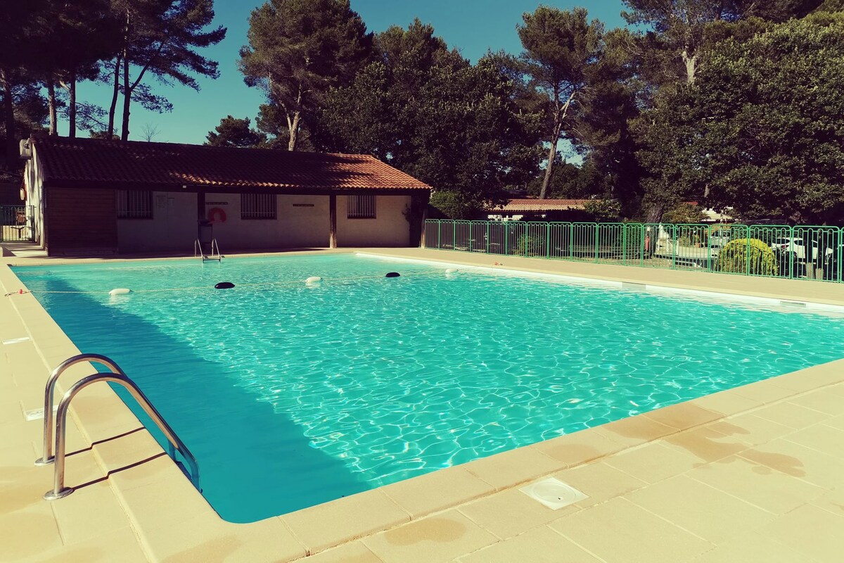 ✅ - Draps et serviettes fournis 🅿️ - Parking sécurisé et gratuit ❄️ - Climatisé 💰- Aucun frais de ménage ! Détendez-vous dans ce logement unique et tranquille au sein d’une résidence sécurisée en pleine nature. Le studio dispose d’une belle vue dégagée. La piscine est ouverte tout les jours de 9h00 à 21h00. Le logement est à deux pas du célèbre circuit Paul Ricard mais également proche du parc OK Corral et de nombreux restaurants et snacks. Bandol : 20 min Toulon : 30 min