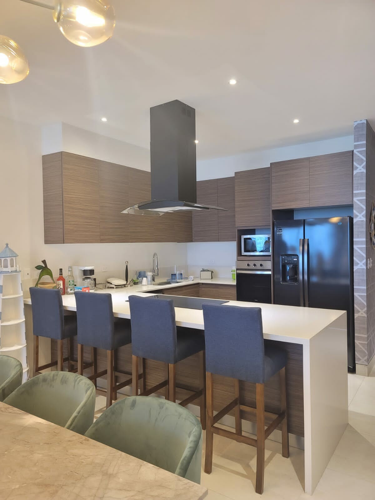 Hermoso departamento totalmente equipado en 3er piso con vista al mar, dos estacionamientos techados. Amplia área social de sala, comedor con bar. Tres habitaciones. Cocina con refrigerador, cafetera, microondas, licuadora y hornito electrico. Sartenes, vasos, cubiertos, platos y de más basicos de cocina. tres recamaras , dos baños completos, AC, TV con cable en sala y cuarto. WIFI en todo el departamento, smart TVs.