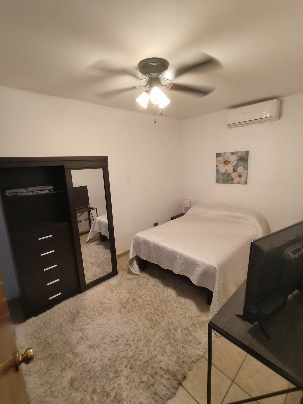 Cómoda casa amueblada de una planta con dos recámaras, se encuentra en una zona muy tranquila y segura. con estacionamiento enrejado, aire acondicionado en cada cuarto y areas comunes. Se encuentra a 5 min de ITSON, 8 min. de IMSS y Laguna del Náinari, y a 2 calles del supermercado Ley. Hay restaurantes cerca con muchas opciones para comer, accesible via uber, cuenta con electrodomésticos de uso común, grifo de agua purificada, utensilios para cocinar, lavadora, y TVs en cada recamara, y WIFI.