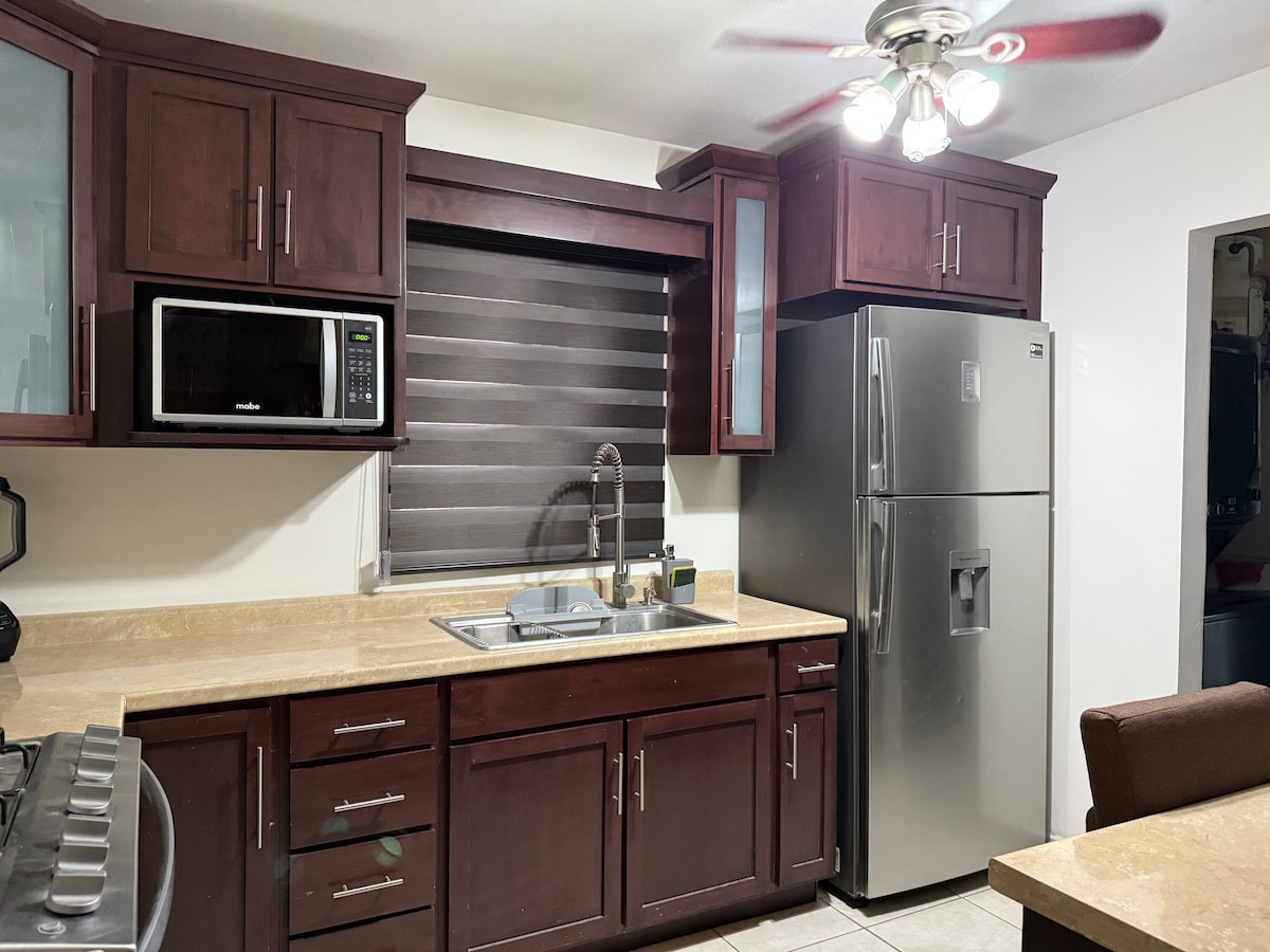 Un elegante alojamiento con amplia sala de estar, recámara principal tamaño Queen con baño privado, clóset, TV y escritorio. Una segunda recámara en espacio abierto con cama Queen, clóset, TV y escritorio. Un 2do baño completo adicional para visitas, recibidor, cocina equipada, con estufa de gas, Relájate en un jardín compartido con asador listo para una carnita asada bajo la sobra de espectaculares bambú en una mesa de jardín. Llega caminando a una cuadra al IMSS
