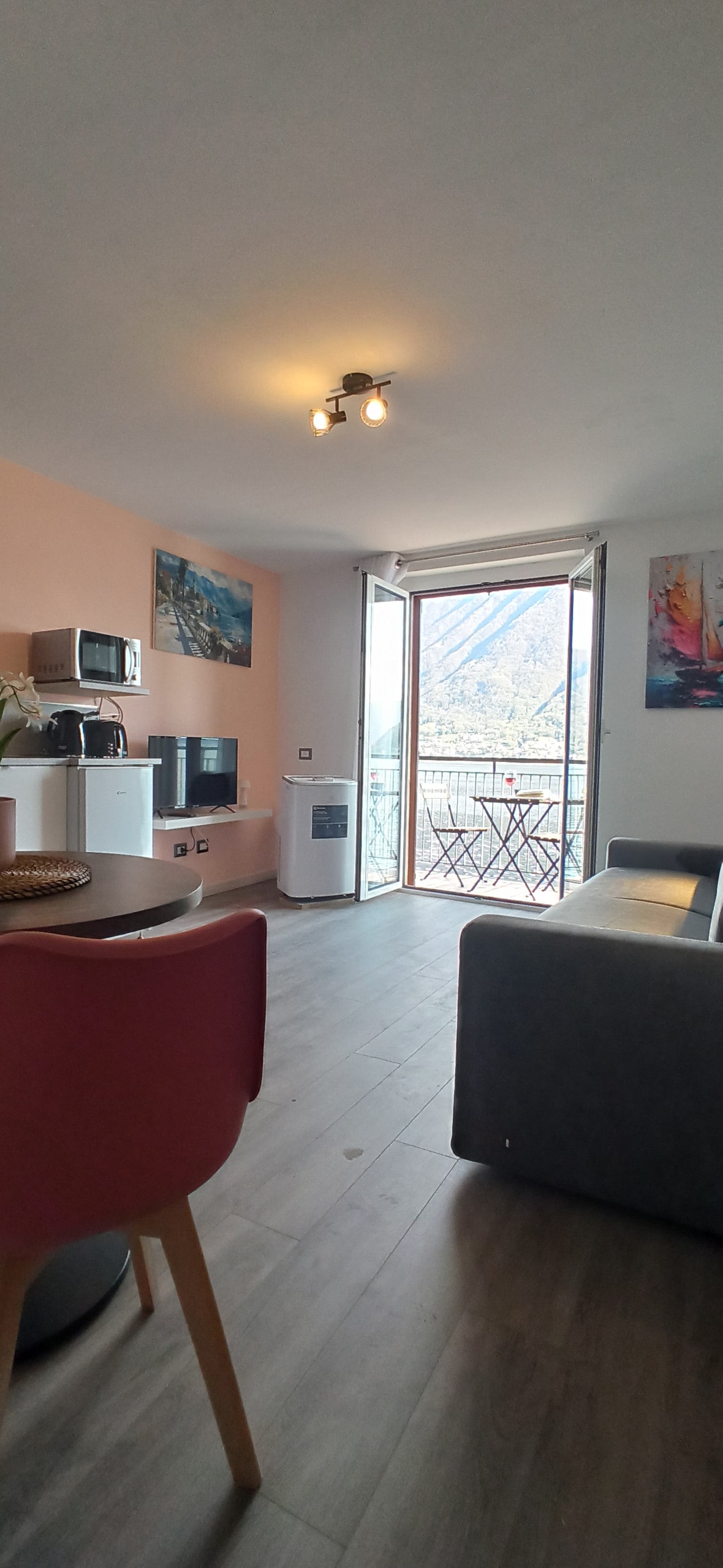 Apartamento con seis escalones antes de la entrada. Moderno y recién reformado. Salón bien iluminado con Smart TV de 43 pulgadas (Netflix) y wifi privado. Con balcón y espléndidas vistas al lago y a las montañas, posibilidad de una cama (sofá). Baño con bañera, bidé y lavadora. Cocina bien equipada con cafetera, nevera y congelador, horno, microondas, ollas, platos y cubiertos. Dormitorio que también puede alojar una cuna, con un gran armario.