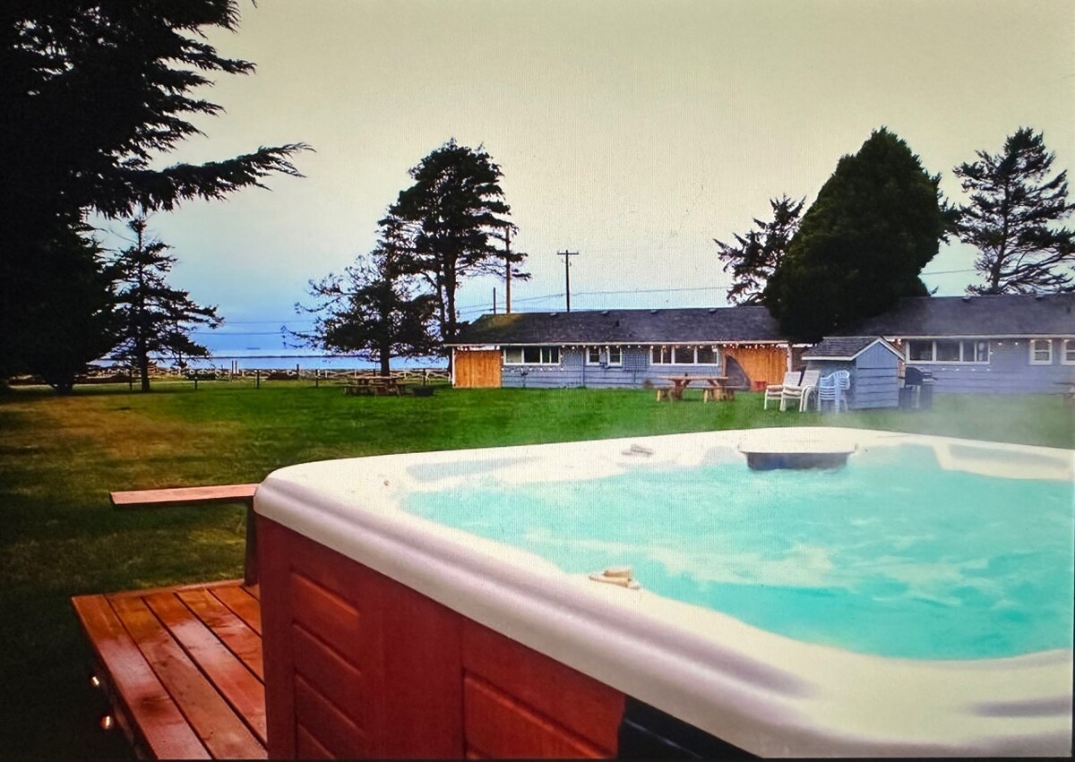¡Una habitación en nuestro hotel boutique lateral a una propiedad frente al mar de 7 acres, con acceso a la playa privada! Observa las montañas olímpicas mientras disfrutas de la chimenea de leña o siéntate en tu bata de spa en tu propio patio con vistas al agua. Este estudio tiene una pequeña cocina (nevera, microondas, cafetera). Cama king y tumbona en euros, ducha a ras de suelo. Nuestra propiedad también tiene un gazebo compartido, un mini mercado de compras (solo para huéspedes) y una estación de carga de vehículos eléctricos si es necesario.