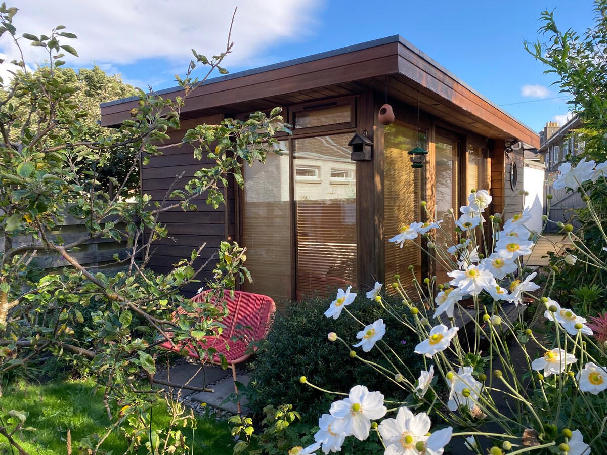 Una casa de huéspedes privada en un precioso jardín, un refugio tranquilo en las afueras del centro de la ciudad de Edimburgo. La sala de estar principal consta de una cama doble, comedor y cocina pequeña (nevera, microondas, tostadora, hervidor de agua). Esto no es una cocina completa y no incluye un fregadero. Fuera de la sala de estar principal hay un inodoro/ducha. El acceso privado y un estacionamiento dedicado son a través de una puerta segura en un carril tranquilo. El centro de la ciudad está a 15 minutos en autobús y hay varios autobuses regulares.
