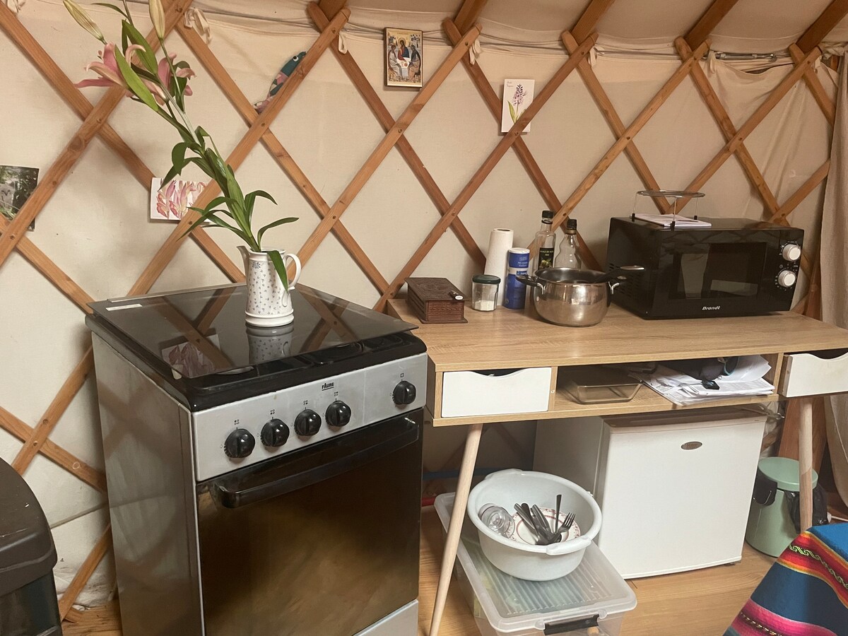 Disfrute del encantador entorno de este romántico alojamiento en un lugar boscoso. Esta yurta es perfecta para escapadas románticas. El canto de los pájaros, el calor de la estufa de leña, el pozo de luz. ¡La yurta también es muy buena para las familias pequeñas! Hay un futbolín instalado:) Con mi marido somos masajistas diplomados y ofrecemos nuestros servicios. También estamos conectados con un spa/ balneario muy cerca.