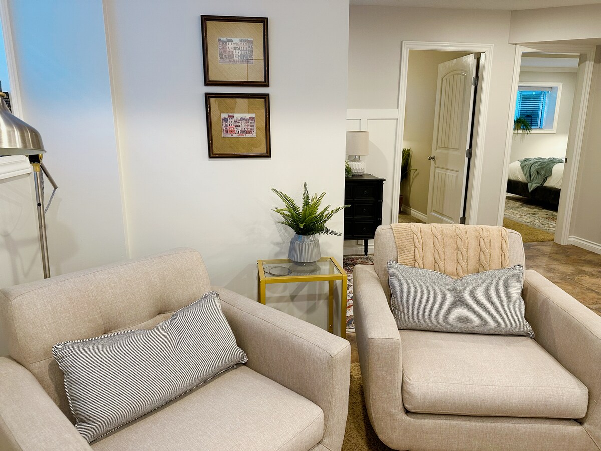 Newly renovated 600 square feet of bright cozy comfort. Beach style decor to get you into vacation mode with the home away from home feel. Perfect for business or pleasure. 5G WIFI included. Telus Cable, Netflix, Prime, Disney and Apple TV included. Fully equipped private kitchen with dishwasher. 1 bdrm with queen size bed and luxury high end brand new mattress + new double sofa bed in living room. In Suite Laundry with detergents included. Well-lit street parking, stairs up to entrance.