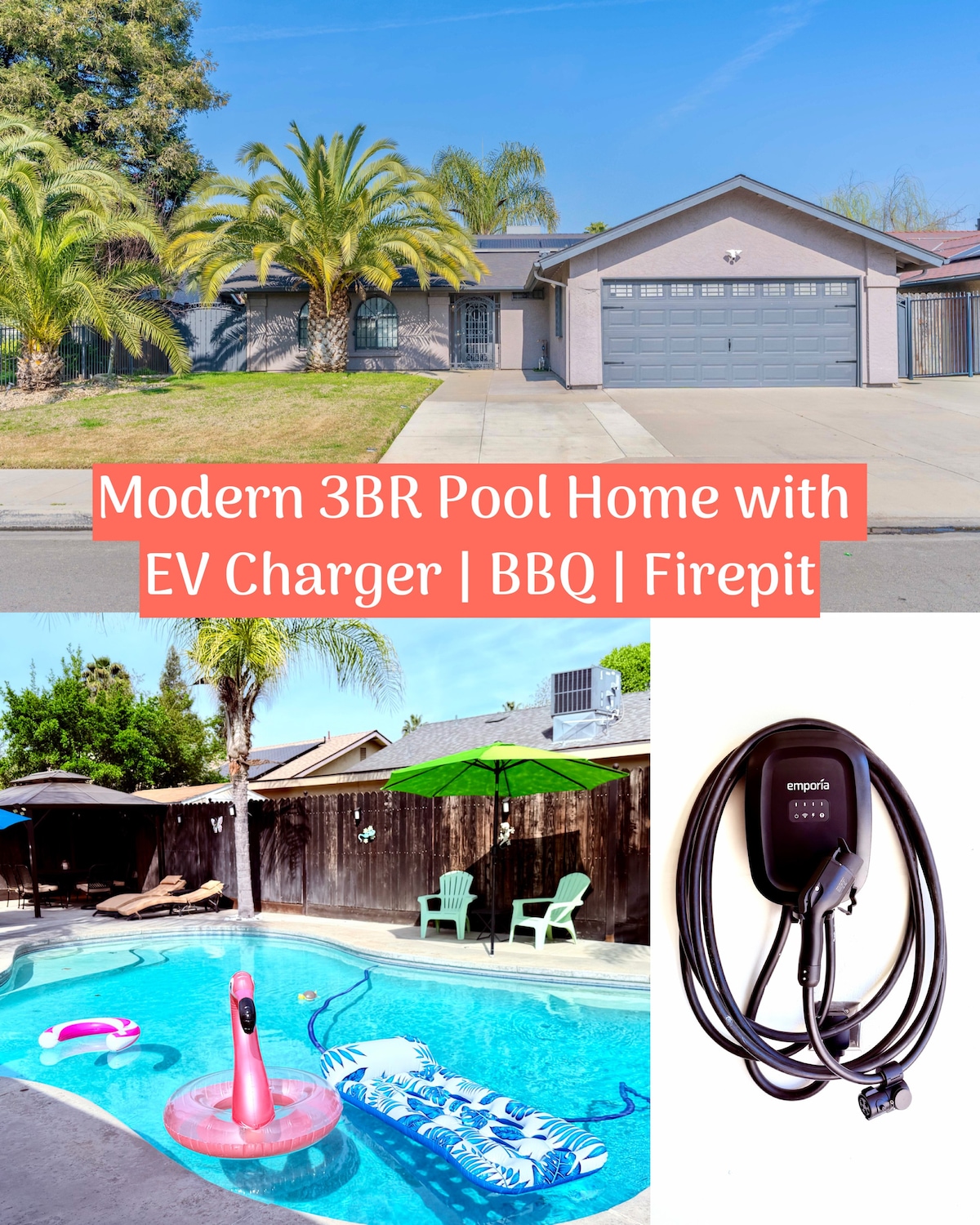 Escápate a este moderno oasis de 3 dormitorios y 2 baños en Fresno, ¡perfecto para familias, grupos y viajeros por igual! El alojamiento cuenta con un espacio de trabajo dedicado, un televisor inteligente de 65 pulgadas y ropa de cama de estilo hotelero para una máxima comodidad. Lo más destacado es el refugio privado en el patio trasero, que incluye una reluciente piscina, un comedor al aire libre bajo un gazebo, una chimenea con asientos adicionales, una parrilla y un cargador para vehículos eléctricos para tu comodidad. Hay mucho espacio de estacionamiento, incluido el acceso al garaje. Mi casa ofrece la combinación perfecta de lujo y relajación.