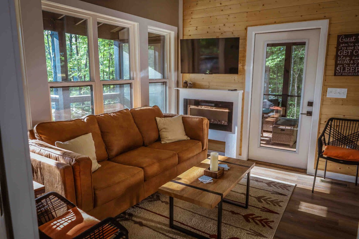 Whether you are looking to relax, adventure outdoors, or enjoy live music at the nearby Caverns, our tiny home, Ripple Reed Cove, is the perfect escape. Feel as though you are waking up in the trees with floor to ceiling windows. We are one of the few homes in the neighborhood with a private dock – perfect for savoring your morning coffee or taking in the gorgeous sunsets. Our tiny home is the optimal getaway with a full kitchen, fire pit, spacious living room and multiple outdoor living spaces.