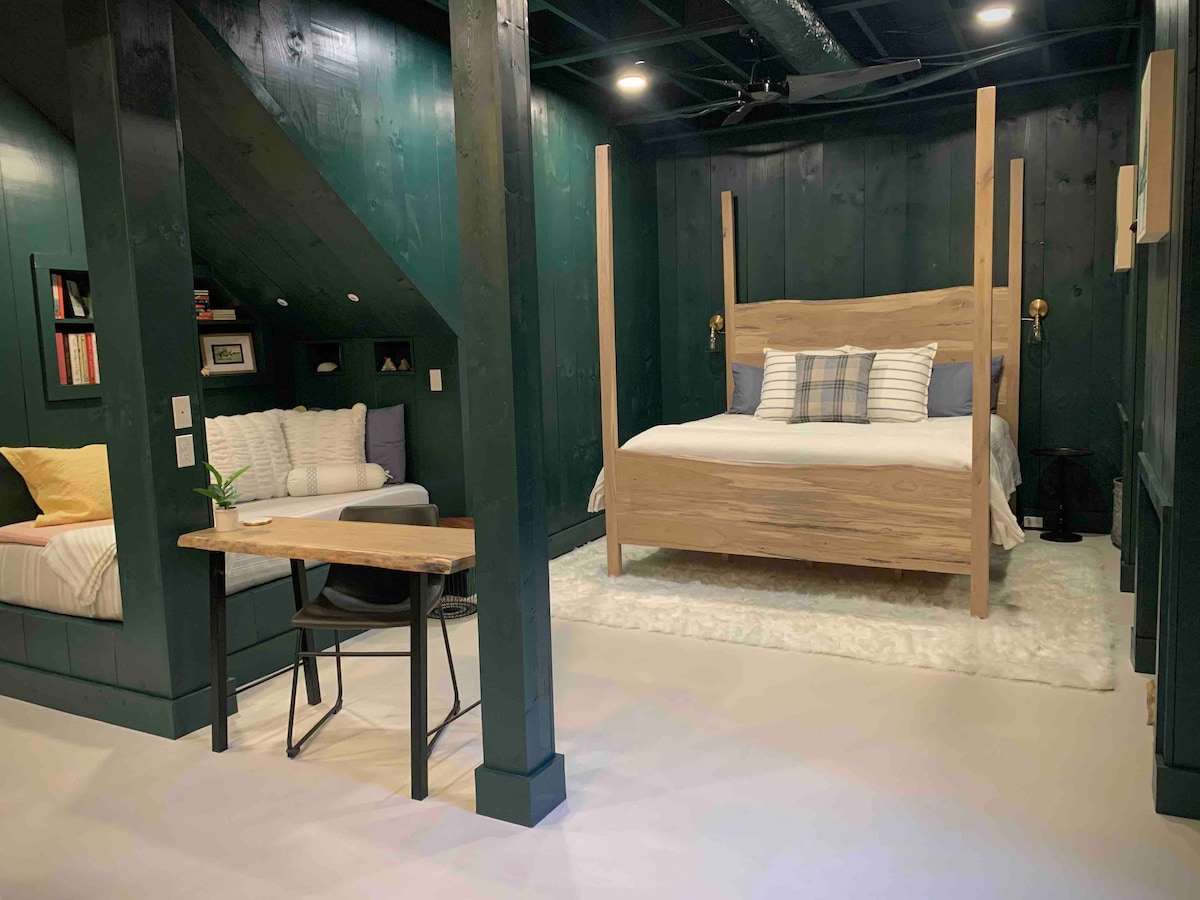 Relájate y desconecta en este alojamiento único y acogedor, ideal tanto para visitar Battery Atlanta como para recorrer kilómetros de senderos naturales. El Forest Flat es un destino de viaje, un campamento base de trabajo remoto o un alojamiento en el área de Atlanta. Este refugio privado para huéspedes estilo estudio en el sótano de nuestra casa incluye una entrada independiente, techos altos y muebles de roble hechos a medida.