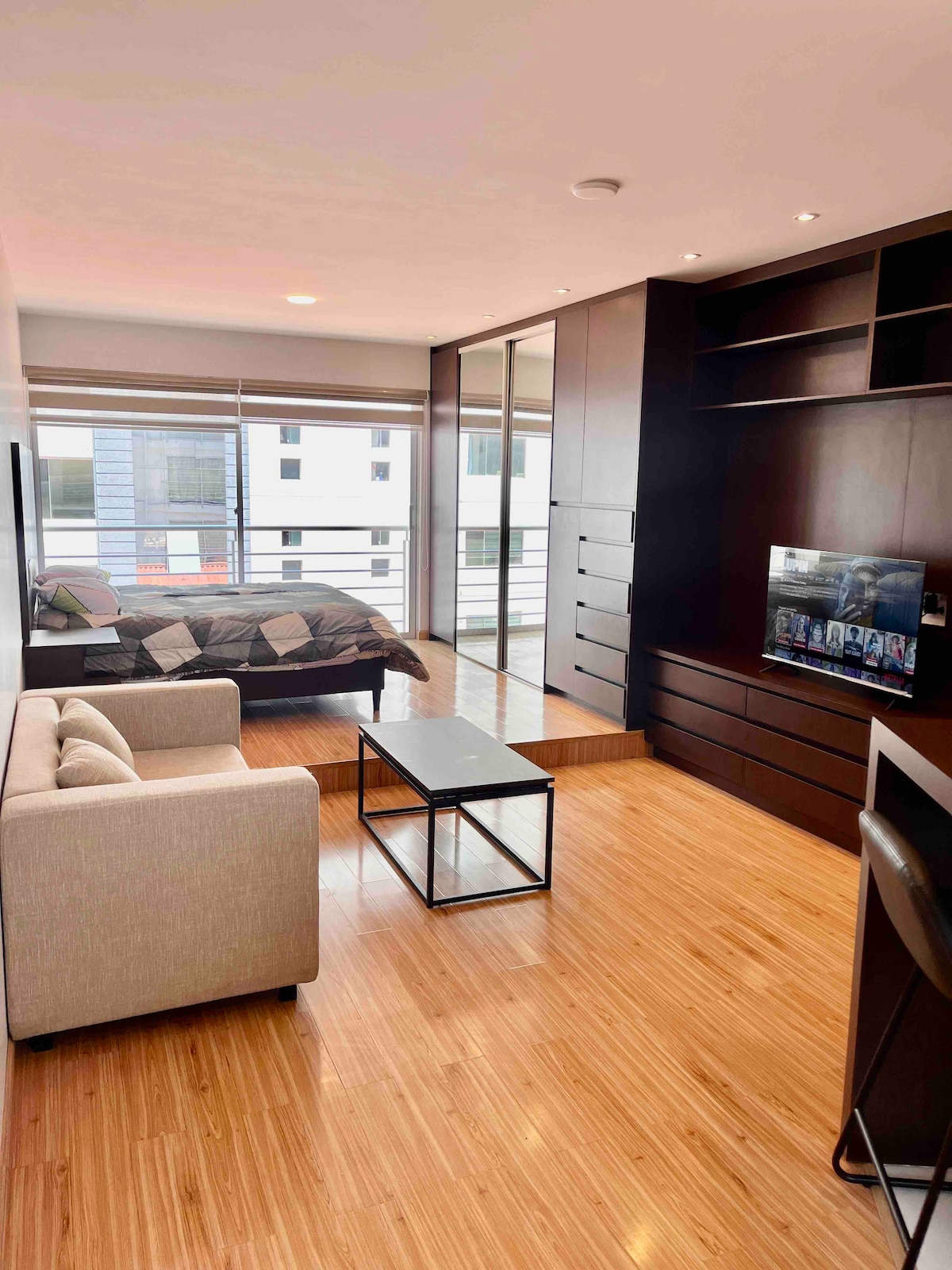 Descansa y disfruta en este moderno monoambiente, diseñado para brindarte confort y tranquilidad. Ubicado en una zona privilegiada, este espacio cuenta con todas las comodidades necesarias, incluyendo Smart TV, WiFi de alta velocidad, lavadora propia. Además, tendrás acceso a piscina (previa reserva), jacuzzi y sauna (pago por uso). Perfecto para viajes de negocios o escapadas a la ciudad. Disponible de parqueos para alquilar en el edificio.