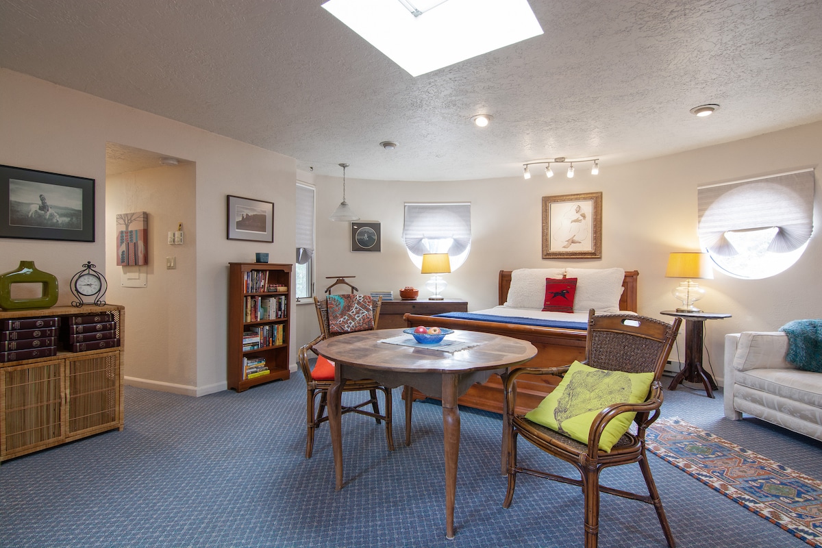 Welcome to Santa Fe! This charming studio cottage and my home share the property in this quiet residential neighborhood. The cottage is full of Santa Fe charm with a cozy, pretty interior, skylights and lots of natural light, a fully-stocked kitchen corner, handmade cabinets, Mexican tile, one comfy queen-sized bed, and a private garden patio. It's a quiet haven but centrally located, just 2 miles from the Plaza/downtown. It's a lovely place for couples, solo adventurers, and business travelers.