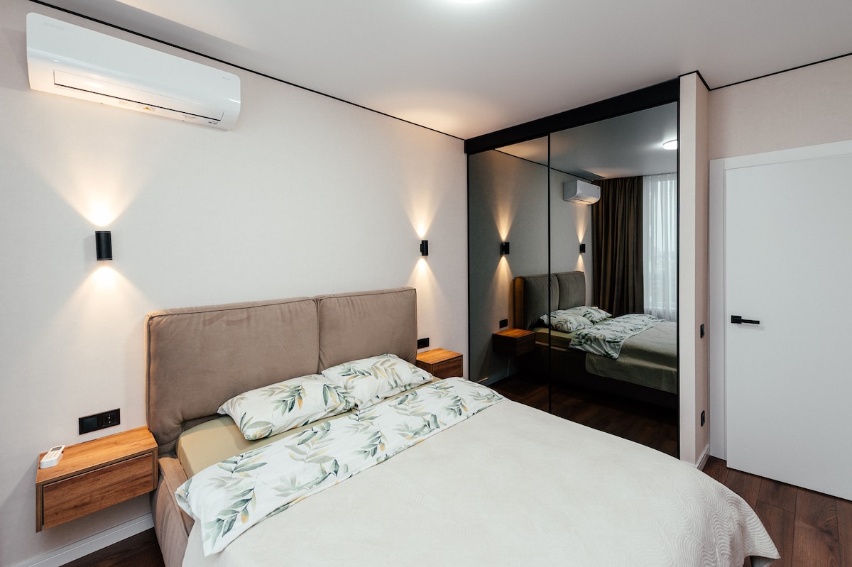 El apartamento tiene una increíble vista panorámica al parque, aquí encontrarás siempre un ambiente limpio y agradable. En el interior tenemos todo lo necesario para tu estancia: lavadora, nevera, aire acondicionado, televisión, ropa de cama, toallas y todo lo necesario para cocinar. El apartamento se encuentra en la parte central de la ciudad, cerca de Kaufland, Shoping Malldova, transporte público directo al aeropuerto.
