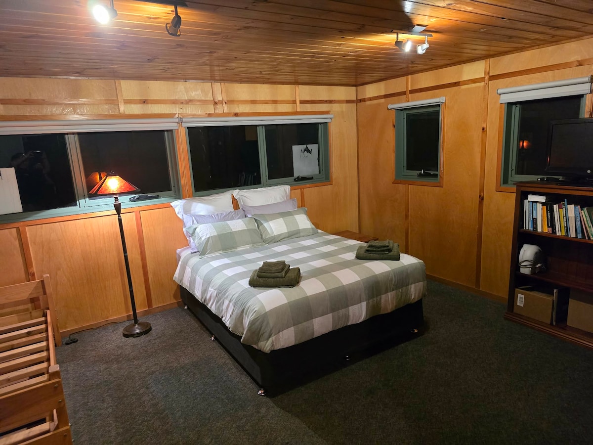Retiro perfecto para parejas: una cabaña totalmente independiente escondida en un tranquilo entorno de arbustos en el borde del bosque estatal de Otway. Rodeado de un antiguo viñedo, la vida silvestre nativa es abundante: kookaburras, reyezuelos azules, patos, canguros, equidnas y wallabies. En el interior, disfruta de un spa hundido en el salón abierto, cocina completa, lavandería, baño privado y estacionamiento cubierto. Sube a tu propia terraza para relajarte, sumérgete en la tranquilidad y observa cómo el monte cobra vida a tu alrededor.