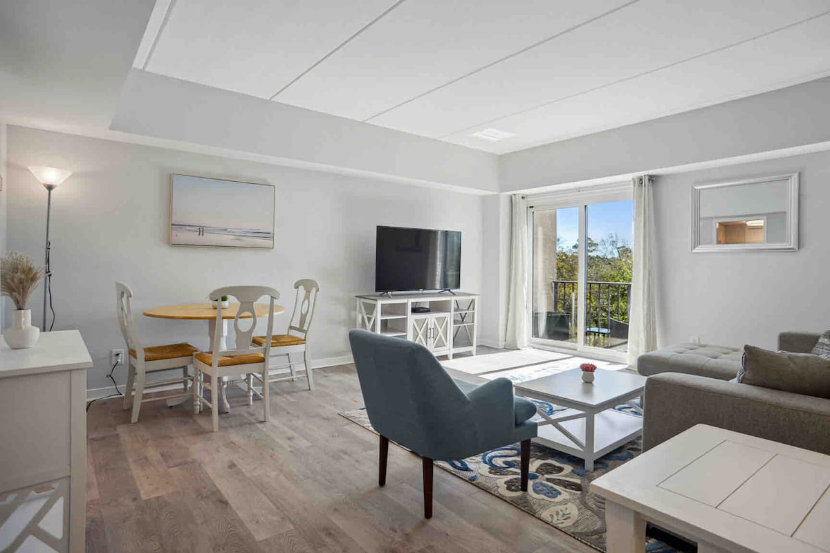 Alójate en un barrio único y tranquilo frente a la playa para tus vacaciones en HHI. Disfruta de un PASEO DE 5 minutos/2 manzanas HASTA LA PLAYA, 2 bicicletas GRATUITAS, Roku con NETFLIX y una ubicación en el centro de la isla para acceder fácilmente a las atracciones locales. Entra en un lugar luminoso, superlimpio y bien surtido con todas las comodidades de un hogar. En el exterior, estás rodeado de robles vivos y paisajes naturales. El apartamento cuenta con una combinación de salón comedor/cocina, 1 dormitorio con cama tamaño queen, baño completo, lavadora y secadora en el vestidor y una terraza con asientos.