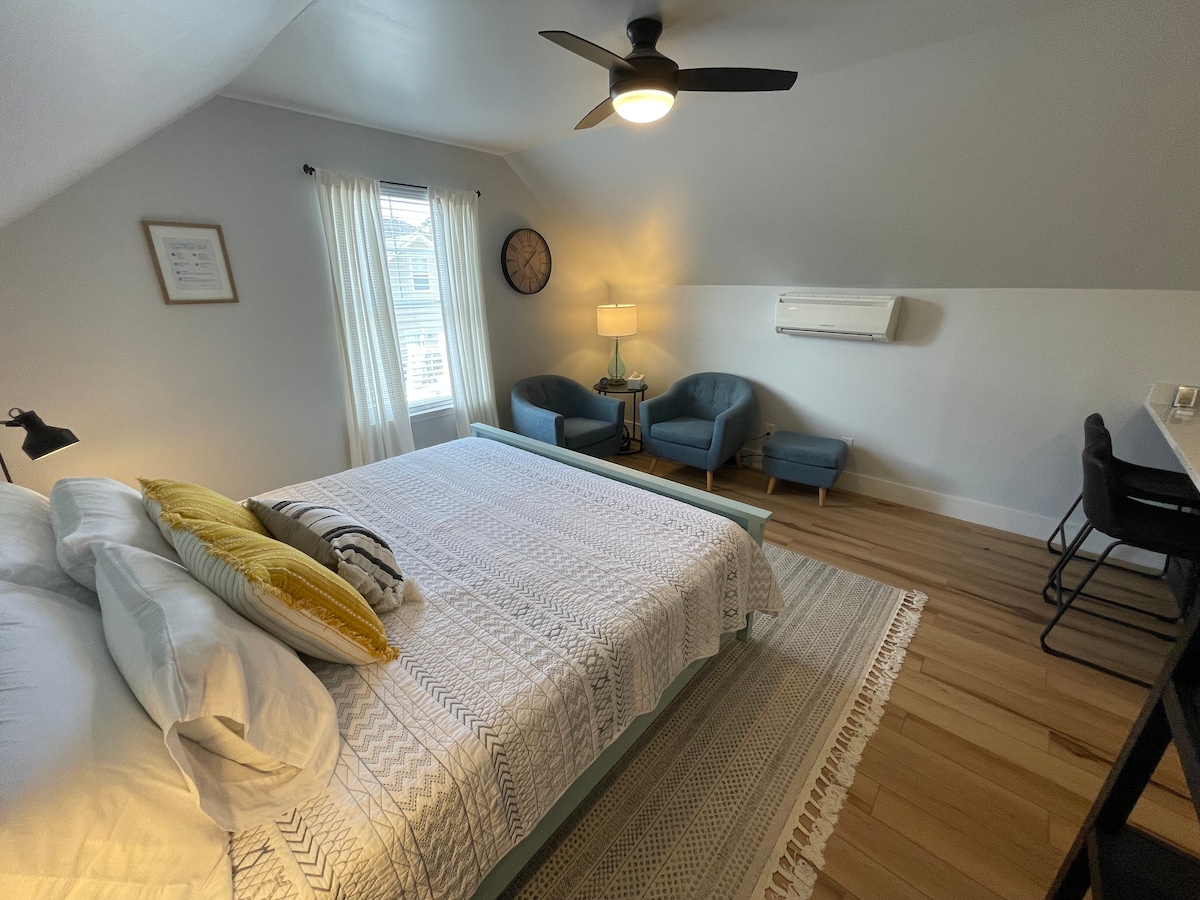 Amplio apartamento tipo estudio situado encima de un garaje independiente con tu propia entrada privada ubicado en el corazón del casco antiguo de Bluffton. A pocos pasos de restaurantes cercanos, boutiques y puestas de sol increíbles en May River. Cama tamaño king nueva, electrodomésticos y sofá modular grande. Cocina completa con mucho espacio para relajarte y guardar tus cosas. Baño de buen tamaño, ducha completa y una gran cantidad de comodidades como chimenea privada, parrilla al aire libre y mesa de patio para tu disfrute. ¡A pocos minutos de las playas de HH!