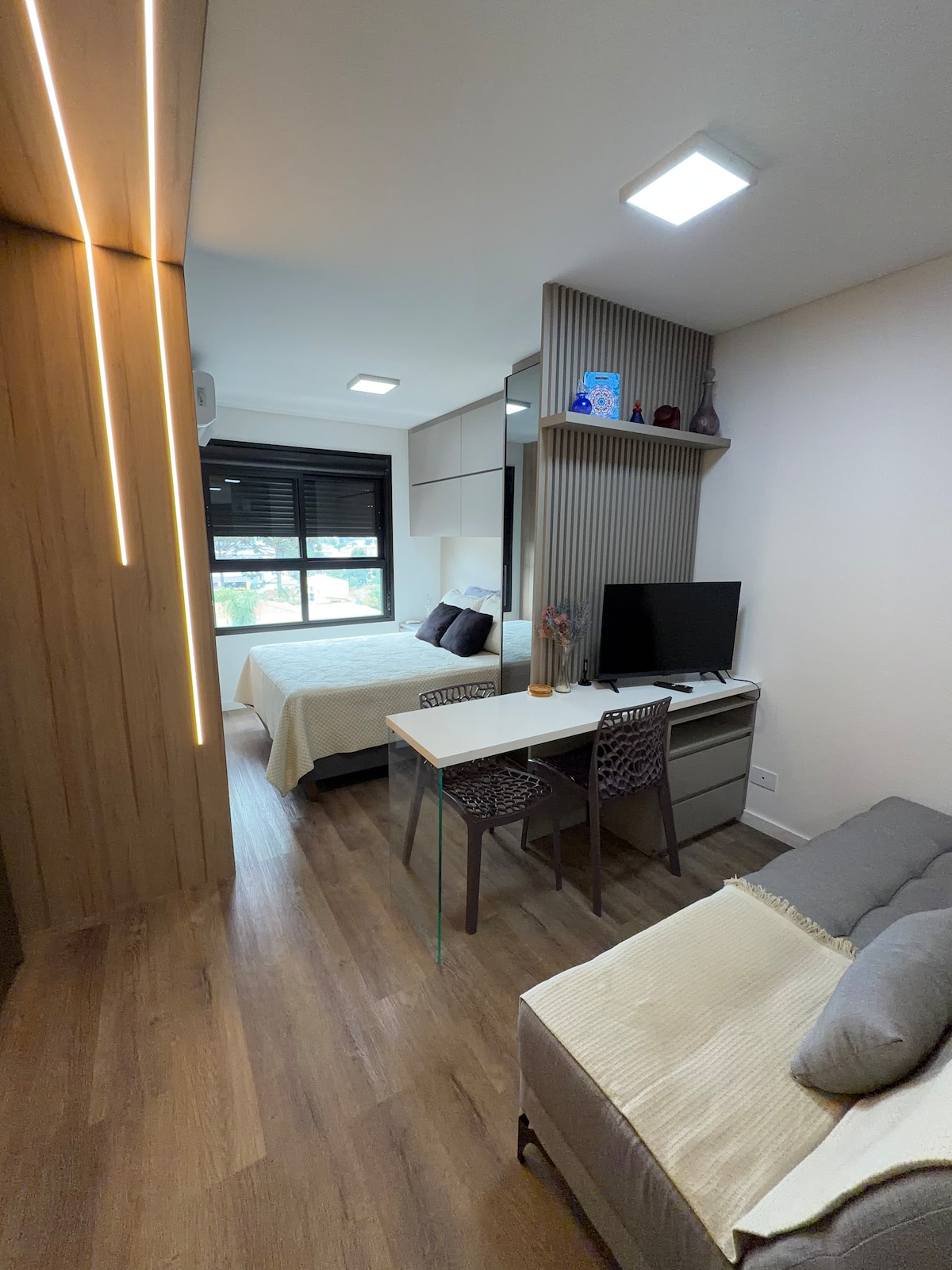 Estudio nuevo (edificio terminado en 2025), funcional y cómodo, con muy buena ventilación y excelente luz natural, ubicado en un barrio residencial tranquilo. Tiene una ubicación estratégica, con fácil acceso al centro de Curitiba y cerca de un parque, farmacias, museos, un supermercado y el Aeropuerto de Bacacheri. El condominio ofrece lavadero, gimnasio, espacio de coworking y una terraza con vistas. ⚠️ Este alojamiento no tiene garaje. ¡Consulta las fechas disponibles y asegura tu estadía!