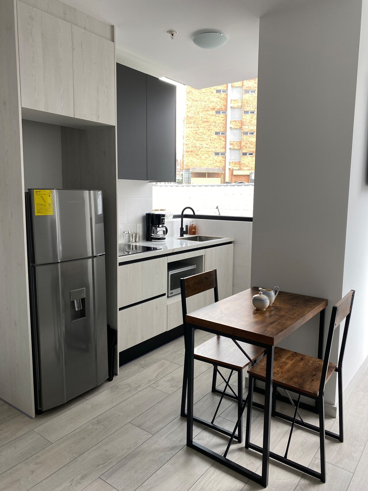 Warm Suite in floor #13 with 1 Queen size bed (high quality bedsheets, duvet and memory foam pillows), 1 sofa bed, maximum 3 guests. TV 75” QLED 4K, Disney+, Electric Black out Curtains, fully equipped kitchen with big Samsung fridge, digital modern oven, microwave and extractor, toaster, Coffee maker, Fast WIFI 343 mbps, working and dining Desk with view of metropolitan forest, clothes closet, Iron, ironing board, and 1 full bathroom with city view, hot water, towels, soap and shampoo