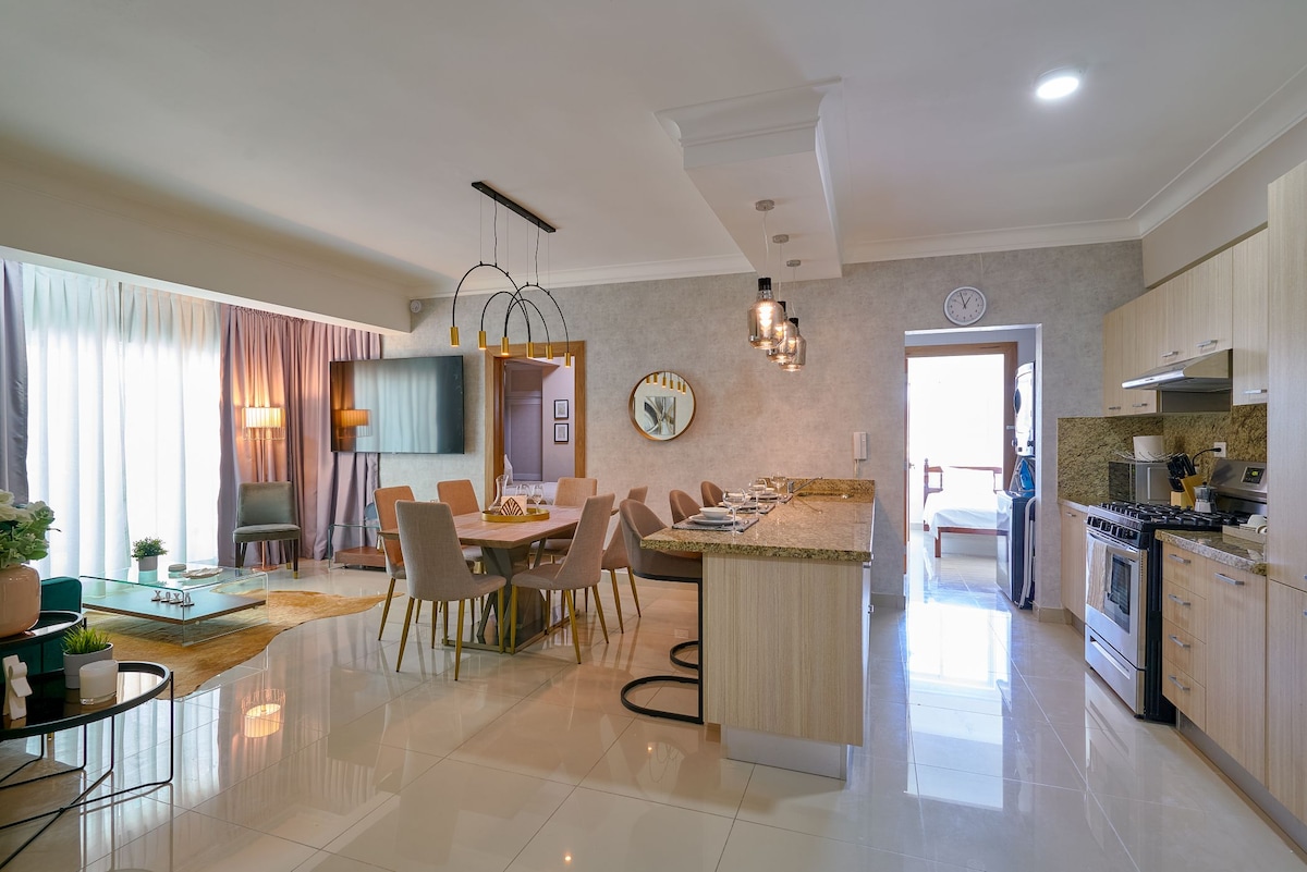 Hermoso y moderno apartamento ubicado en el centro de la ciudad de Santo Domingo, totalmente equipado y amueblado, AC's, Smart TV mas 200 canales, Wi-fi super rapido, parqueo privado techado, area comun con gimnasio, terraza con sillas y BBQ, hermosa vista y todo lo que necesitas en la ciudad a un paso de ti. Sientete como en casa en este encantador y confortable apartamento. Es excelente para viajes de relajación o para viajes de trabajo.