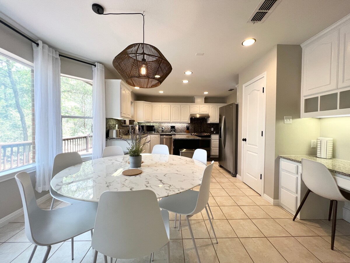 Elegante casa nueva cerca del lago Granbury. Gran habitación con chimenea eléctrica y TV, perfecta para relajarse mientras miras hacia la zona boscosa de la parte trasera, donde los cardenales y las ardillas te dan la bienvenida. Cocina bien equipada y comedor formal. Tres dormitorios con cama tamaño king, queen, dos individuales y un sofá cama extraíble. Habitación para ocho personas, pero perfecta para una escapada en pareja. A poca distancia a pie del lago, zonas de picnic y acceso al muelle de barcos. Casa privada en la comunidad cerrada de Canyon Creek sin vecinos a ningún lado.