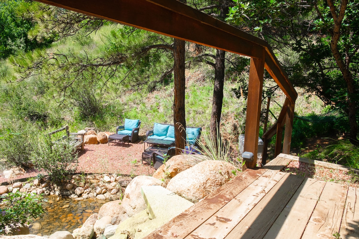 Esta cabaña boho del suroeste está escondida entre los árboles en un barrio histórico y tranquilo al pie del famoso Pikes Peak. Con una amplia terraza delantera, ventanas del suelo al techo y un patio trasero privado y vallado con jacuzzi, chimeneaflor y accesorios para hacer s'mores esperándote a tu llegada, la cabaña tiene maravillosas vistas al bosque y a la montaña, a solo 10 minutos de la cultura y las comodidades de Manitou y Colorado Springs. ¡El lugar perfecto para escapar para un retiro romántico, diversión en familia o unas vacaciones de trabajo!