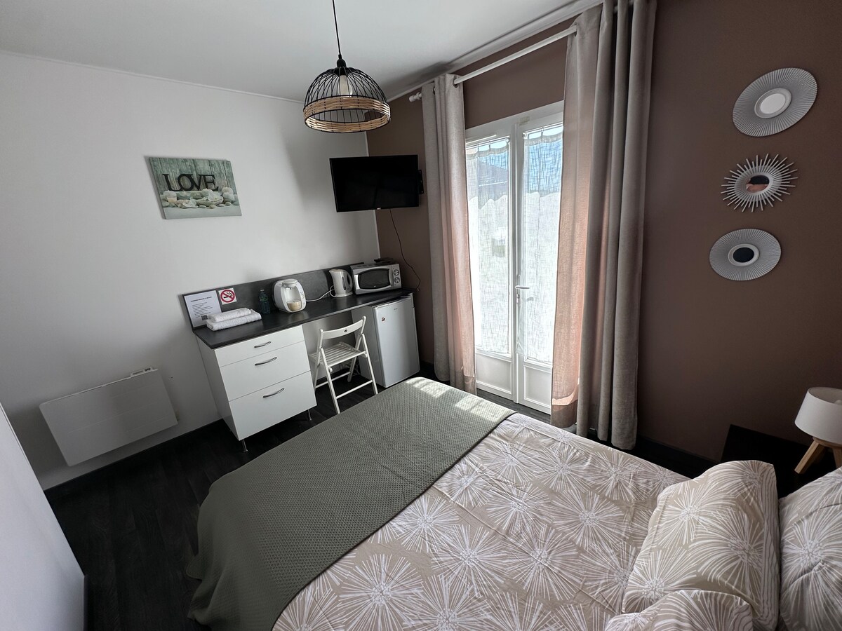 Habitación con cama para 2 personas Baño privado Encimera con zona de cocina que incluye placa eléctrica, cafetera (Tassimo), hervidor de agua, microondas y nevera. Platos, vasos y cubiertos, así como una batería de sartenes y cacerolas disponibles. Habitación equipada con calefacción individual y televisión. Entrada privada por ventana francesa que da a una terraza. Alojamiento totalmente autónomo, con caja de llave exterior. Ropa de cama y toallas incluidas.