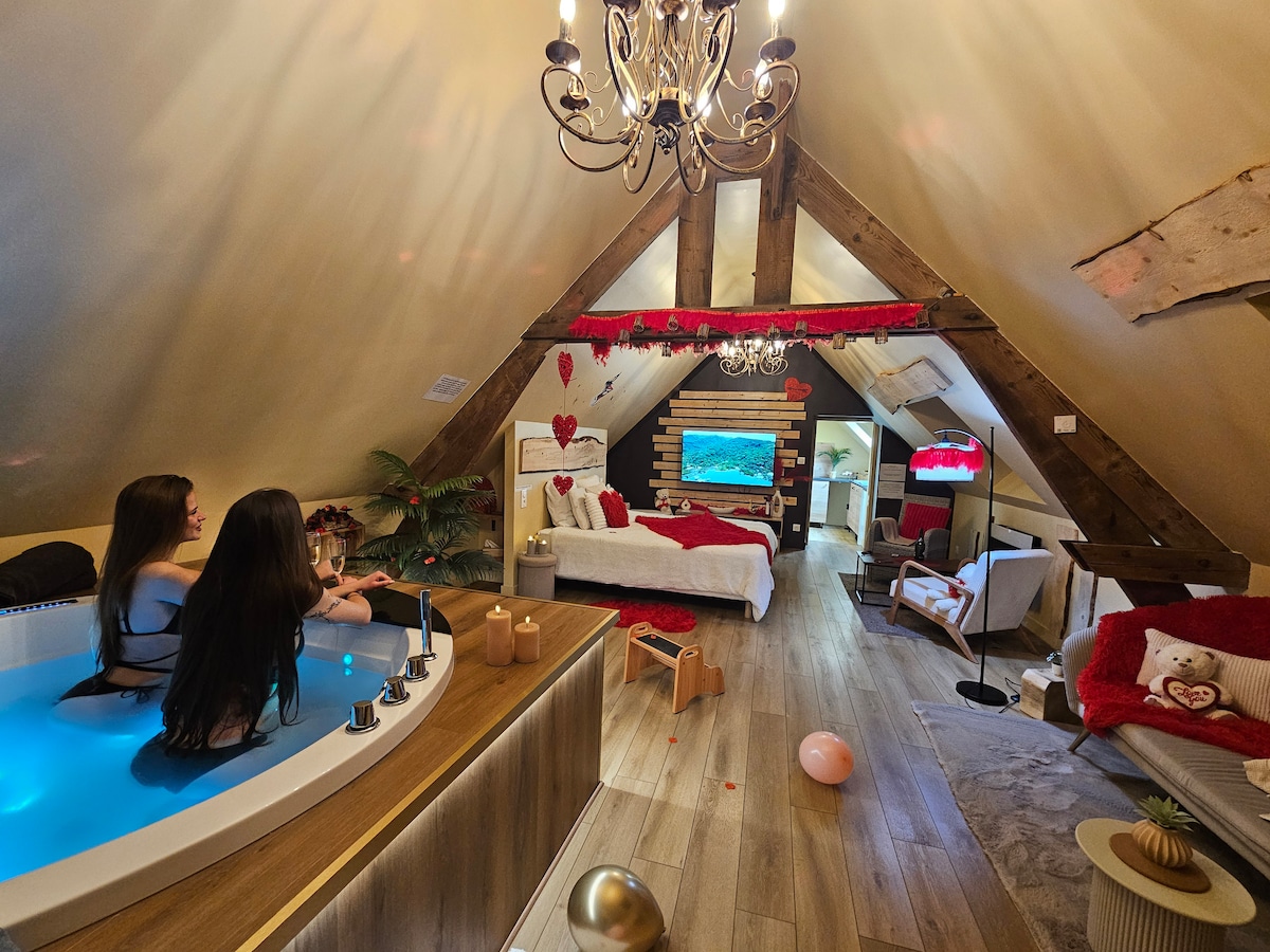 Sumérgete en la evasión y la sensualidad de nuestra habitación secreta, un nido con encanto balinés para una noche de amor inolvidable. Disfrute de una bañera de hidromasaje, una sauna relajante para momentos de relajación, y dé rienda suelta a sus deseos con el sillón tantra sublimado por un espejo XXL Ríee juntos alrededor del futbolín, luego disfrute de una noche suave y voluptuosa en una cama king-size 2m X 2m con sábanas satinadas. Tranquilidad, exotismo y pasión te esperan ¡Reserva pronto! Netflix incluido.