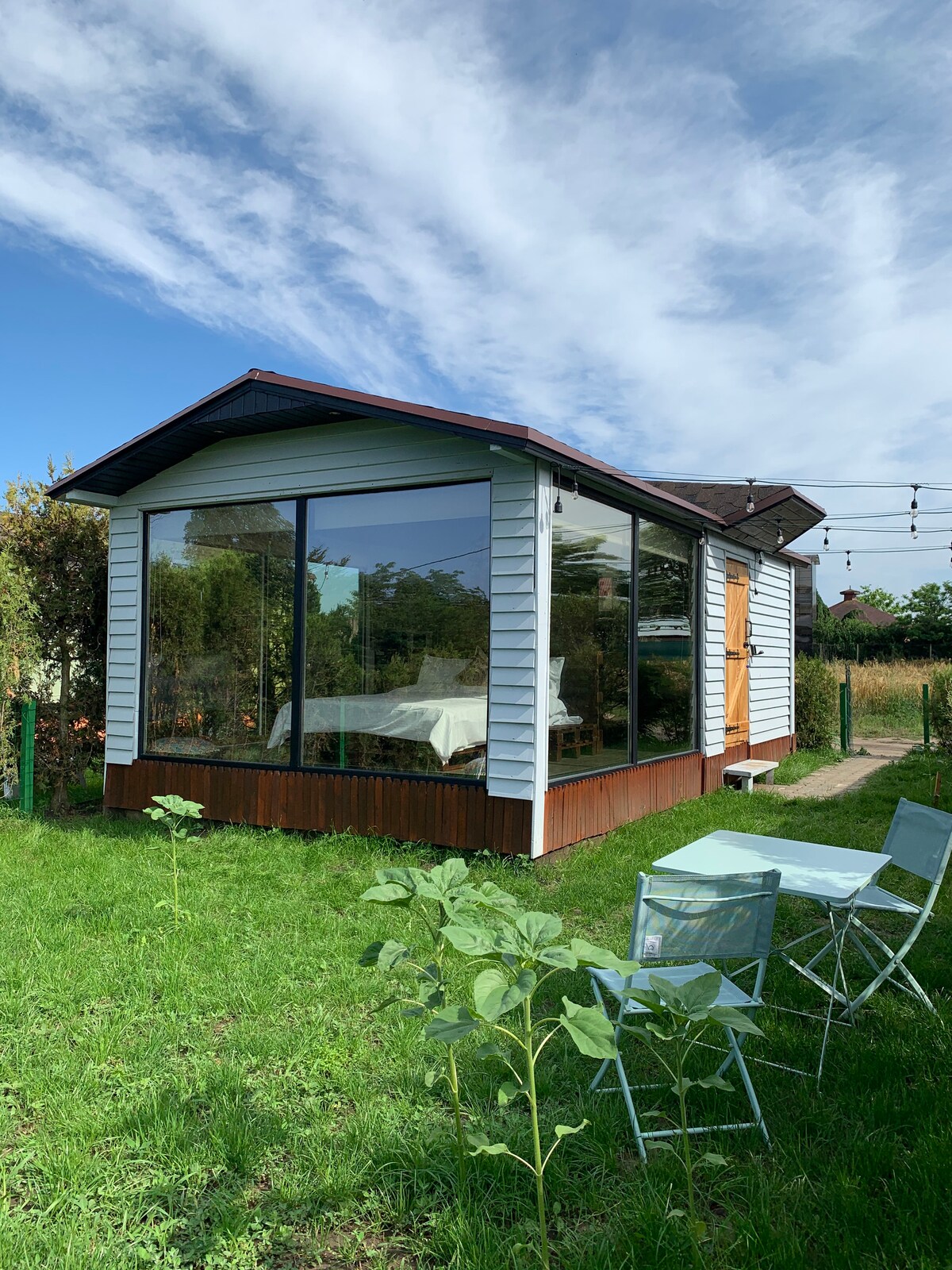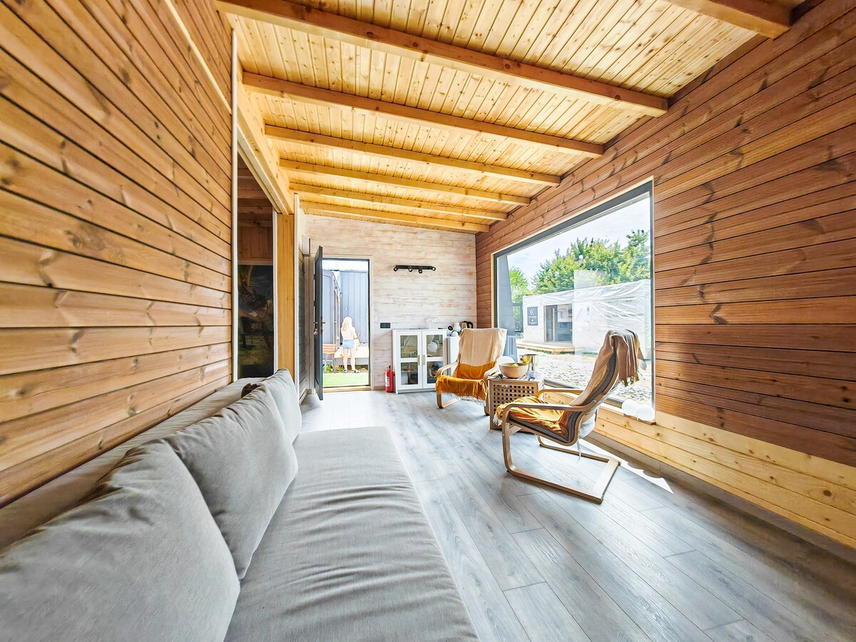 La cabaña móvil puede alojar de 2 a 4 personas (el número de personas se selecciona de la aplicación ) y tiene un dormitorio con una cama tamaño king, una sala de estar con sofá cama para dos, cocina equipada, baño y comedor. Cuenta con terraza propia en un patio verde. Las 3 minicasas de propiedad se encuentran en el mismo patio.