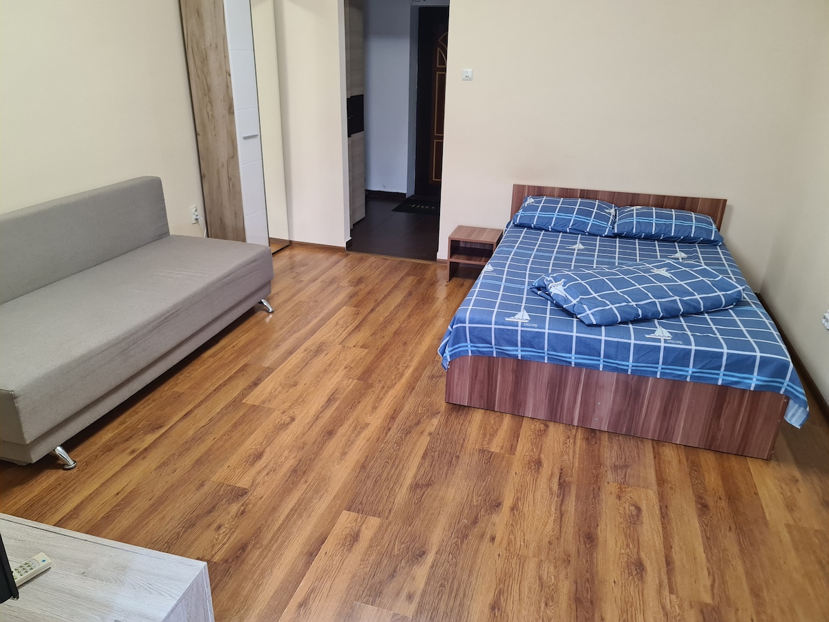 ¡Precioso condominio con vistas completas al mar, justo en la playa! La elección perfecta para familias o para un pequeño grupo de 4 amigos. El apartamento tiene 1 dormitorio con cama doble, sala de estar con sofá extensible para dos, 1 baño, una zona de comedor, una cocina totalmente equipada y un balcón con vista completa al mar. A solo 3 minutos a pie del restaurante de mariscos Reyna, a 5 minutos a pie del supermercado o farmacia local y a 10 minutos a pie del famoso Delfinario de Constanta.