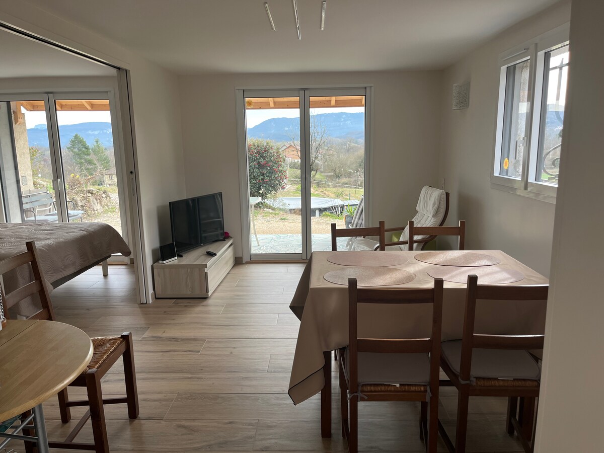 Casa independiente en una antigua granja a 12 km de Belley. Pie de tierra tranquilo, idealmente situado para visitar la hermosa región de Bugey. Consta de una gran sala de estar (30 m2) con una cocina abierta, un primer dormitorio con una cama de matrimonio (140*200), un segundo dormitorio con una cama de matrimonio (140*200) y una cama individual (90*190), un baño luminoso y una zona de escritorio. Podrá disfrutar de una gran terraza parcialmente cubierta con vistas a los prados y al tilo.