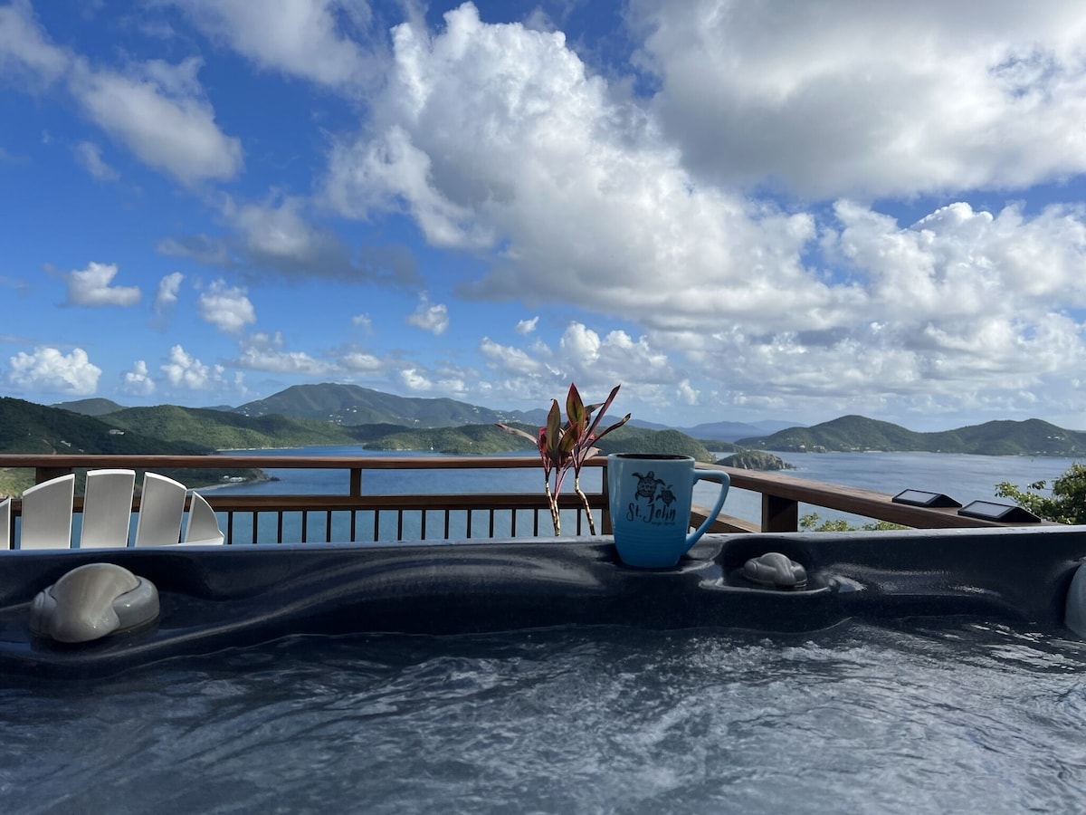 5 ★★★★★ LUJO A UN PRECIO ASEQUIBLE En Coral Bay, el lado tranquilo de St. John. Estudio de lujo con entrada privada, aire acondicionado, cama tamaño king y cocina americana. GENERADOR DE RESPALDO AUTOMÁTICO. A 5 minutos de restaurantes y tiendas de comestibles. Vista de 220 grados de la bahía desde su terraza cubierta a 100 pies sobre la bahía. Carretera y entrada pavimentadas. 4x4, coche.Jeep Wrangler y Liberty en alquiler. Espacio de playa reservado - East End (15-18 m. Dr.) Menú de servicio de habitaciones disponible. Amigable con todas las razas, religiones y LGBTQ. NO FUMAR/NO VAPEAR