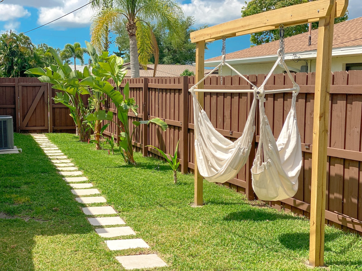 🛜500mbps+ WiFi 🏠Fully private + Private entrance 🌴Hammock Swings ☀️ Outdoor Patio 🦩Private Hot Tub 🥑Kitchenette w/ electric hot plate 😴King Size Bed Loft 📚Work Desk 📺 55 inch Smart TV + Roku ❄️ Cold A/C 🚘 1 parking space NOTE: Accessing the bed requires climbing a ladder. While sturdy and secure, it may not be suitable for guests with mobility limitations, so please consider this before booking.