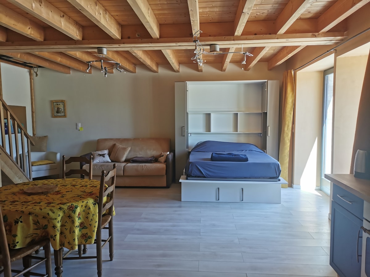 A 8 minutos de la salida A43, entre colegas, amigos o familiares, nuestro granero convertido en estudio independiente en pleno campo con vistas al lago Clair le dará la bienvenida cómodamente para una breve parada o una estancia prolongada. Para 3 a 6 personas, bebés o niños, póngase en contacto con nosotros. Dos camas individuales o una cama doble en el dormitorio. Camas supletorias o cuna en el salón. Acceso al jardín exterior: mesa de pícnic, tumbonas.