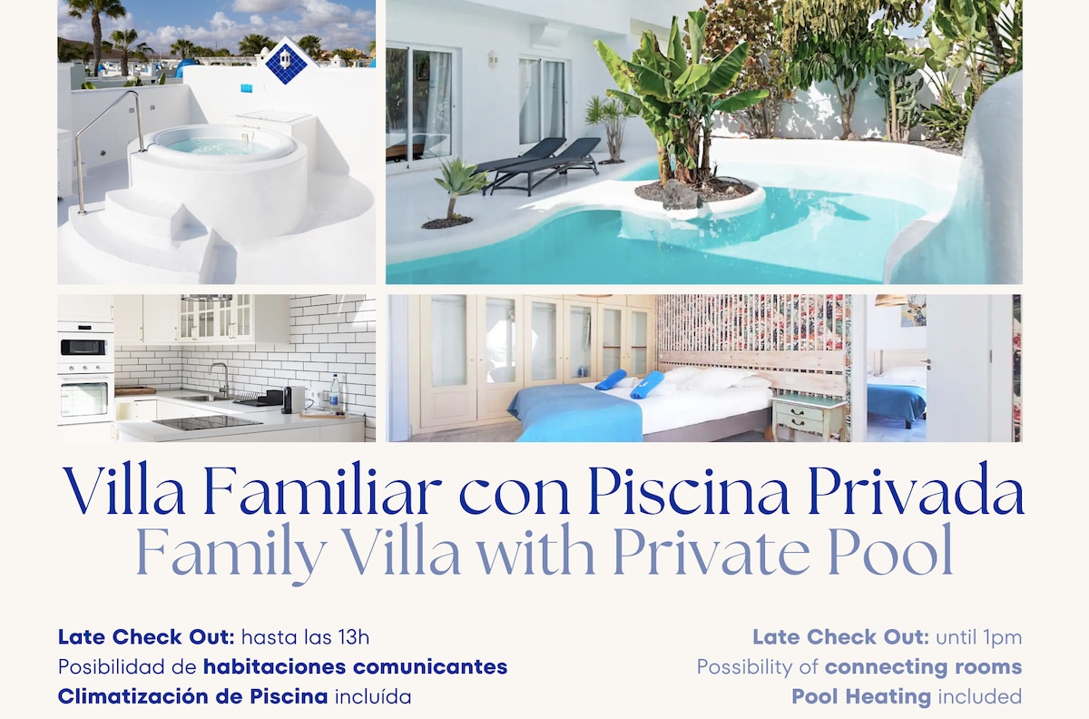 Acogedora y tranquila Villa independiente con piscina privada /puedes estra climatizada con un coste adicional de 20€ por día) . Está situada en las afueras de unos de los principales pueblos turísticos de Fuerteventura, en Corralejo. Podrás disfrutar de paisajes con dunas y kilométricas playas en donde el deporte por excelencia el el Windsurf. Podrás disfrutar de una espectacular gastronomía y un ocio muy confortable junto al mar. Su piscina y jacuzzi privados están ambos climatizados.