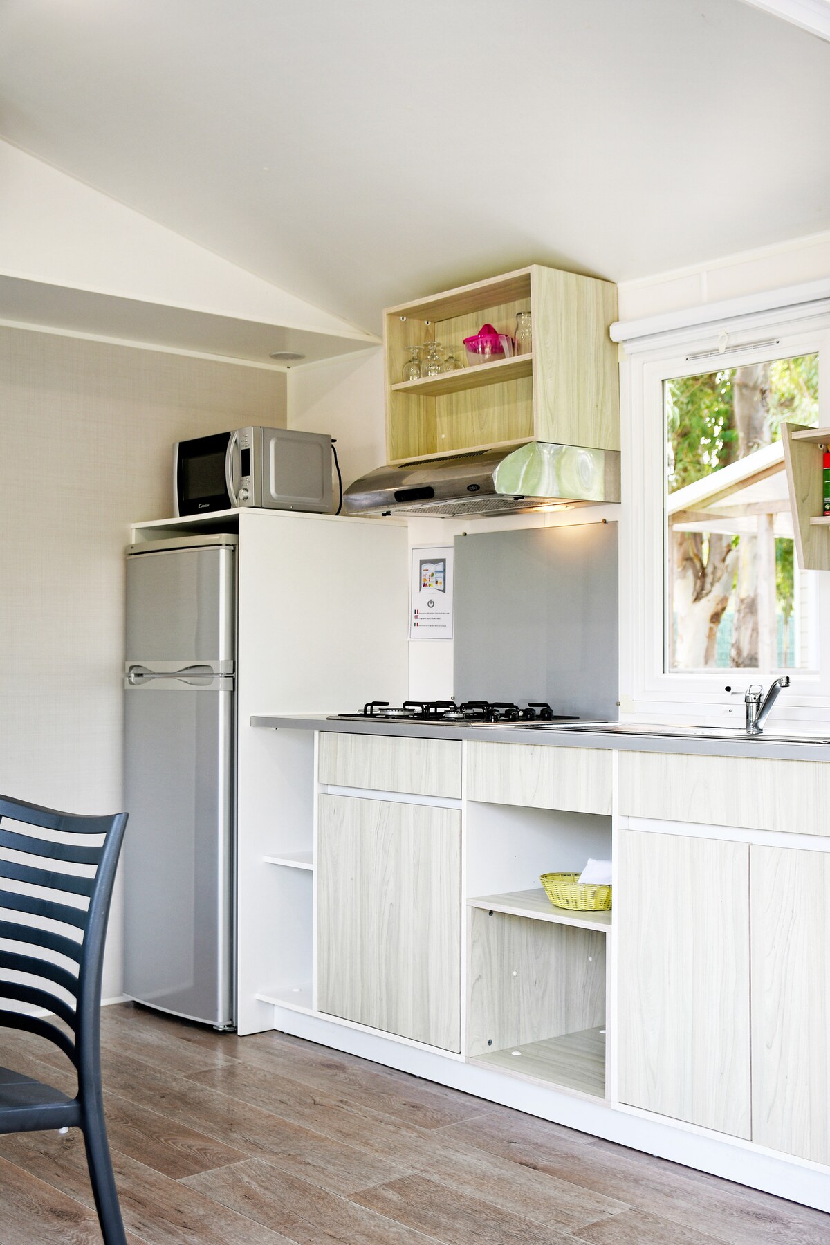 mobil home ubicado en una propiedad de 2000m2 arbolada y segura. Incluye 1 habitación doble y 1 habitación con 2 camas individuales, sala de estar con TV,1 cocina con microondas,cafetera,hervidor de agua,tostadora,lavadora. 1sala de ducha y WC separado. Tiene aire acondicionado. Desde la bonita terraza con flores o una sala de estar ,tenemos acceso a un jardín con mesa ,sillas y barbacoa. Proporcionamos ropa de cama y toallas. Un entorno tranquilo y florido a 2 km de una playa de arena .