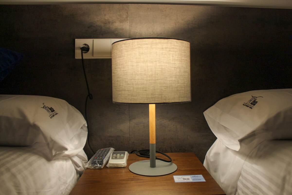 Habitación familiar con baño privado - 3 o 4 camas- de 25m² de superficie Dispone de: 1. Cama de matrimonio de 1,90m x 1,80m y dos camas individuales de 1,90m x 0,90m, o 4 camas individuales (consulte preferencias con recepción). 2. Baño privado completo. 3. Armario con perchas. 4. Lámpara de lectura por cama. 5. Aire acondicionado regulable (frío y calor). 6. Iluminación natural. 7. Ventilación directa al exterior. 8. Ropa de cama incluida. 9. Servicio de toallas bajo alquiler.