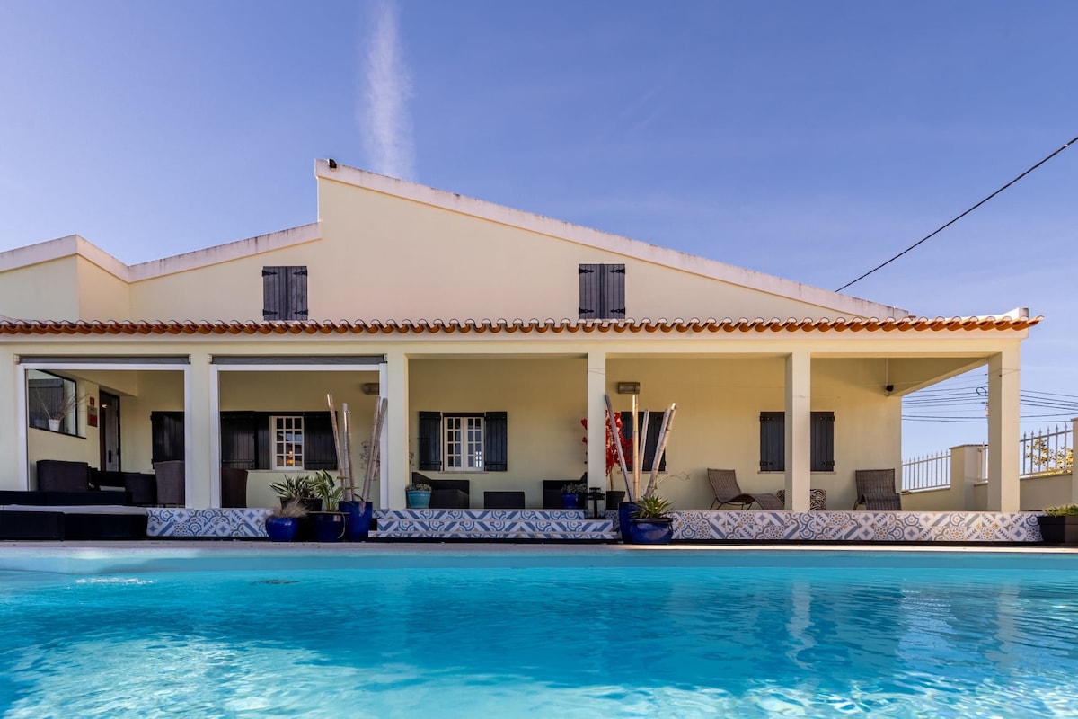 This is a beautiful villa with many amenities and sleeps up to 6 guests. The property has lovely views, in a 3.5-hectares nature reserve of pine trees, orchards and gardens. The space is very romantic, quiet and gated. Have access to a large swimming pool that is well-maintained and heated (maximum 29º) with a removable roof. Playground for kids with swings, basketball, ping pong and football table areas. 7-min near Aldeia do Meco beaches and Cabo Espichel.