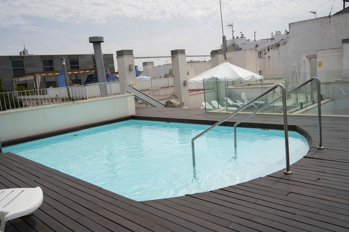 Maravilloso apartamento en edificio completamente rehabilitado en 2023 con materiales de altísima calidad tratados artesanalmente. Cuenta con 2 dormitorios, 2 baños, salón, comedor y cocina integrada completamente equipada (horno, microondas, cafetera Nespresso Vertuo, etc... Sistema de aire acondicionado y calefacción centralizado. En Planta Ático cuenta con Piscina y Solárium con vistas panorámicas a la Ciudad. PARKING CERCANO GRATUITO BAJO DEMANDA
