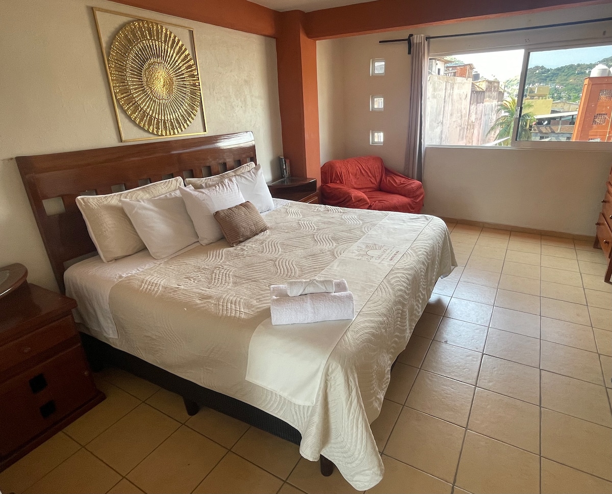 Relájate en esta escapada única y tranquila. "Departamento acogedor en el corazón del centro de Zihuatanejo, a solo una cuadra de la playa principal. Disfruta de una vista parcial al mar y de la vida nocturna en restaurantes, bares y tiendas cercanas. Este pequeño departamento cuenta con todo lo que necesitas para una estancia cómoda: cocina equipada, dormitorio con cama King size y baño privado. Ideal para parejas o viajeros que buscan una estancia relajada y con fácil acceso a todo."