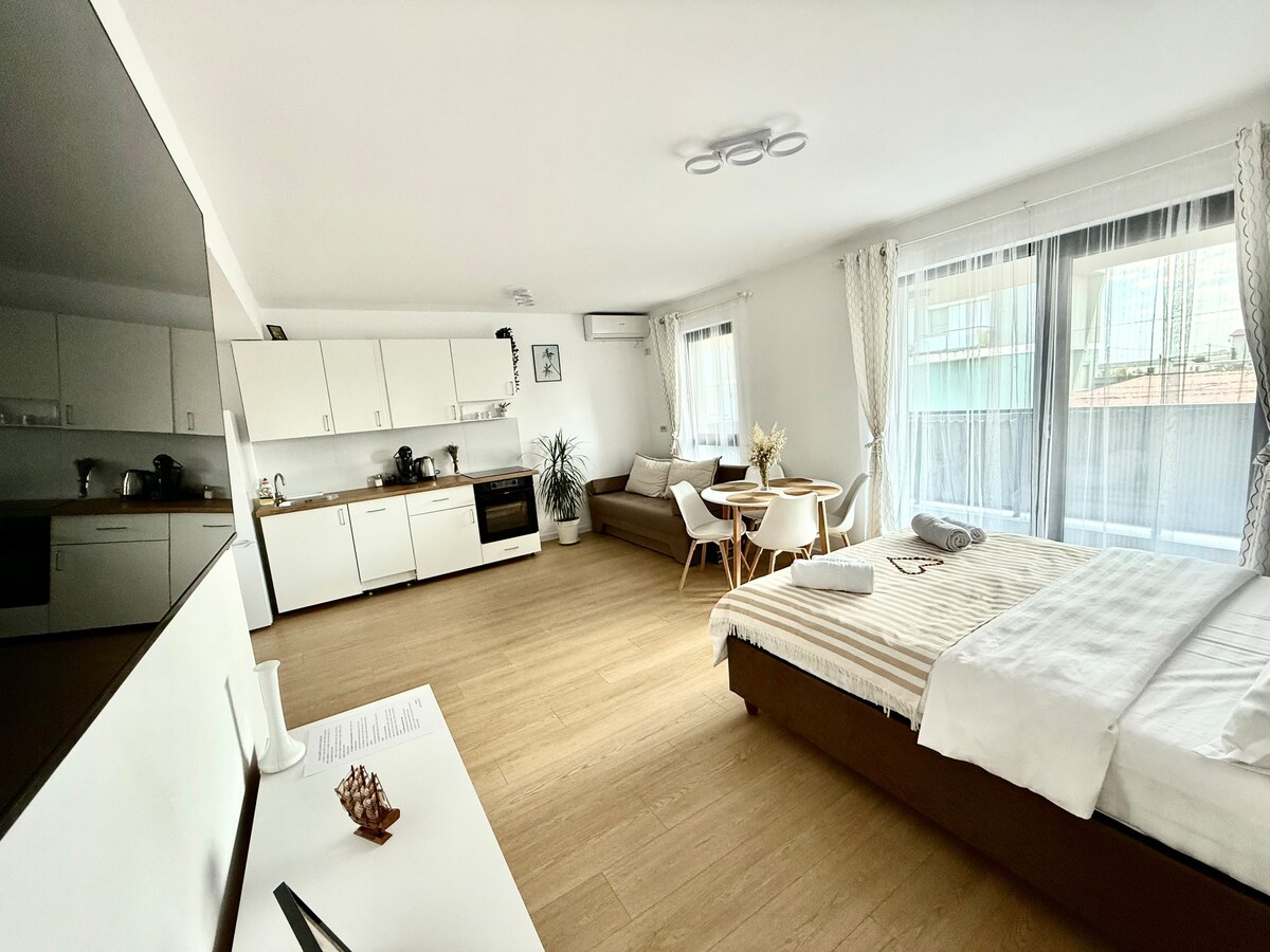Este acogedor estudio se encuentra en un edificio nuevo y moderno con aparcamiento; a solo unos pasos del famoso naufragio y la ubicación del festival Beach Please, ideal para los amantes del mar, el sol y la diversión. El estudio tiene una superficie de 46 metros cuadrados, una capacidad máxima de 4 personas, siendo perfecto para una pareja, una familia o un grupo de amigos. Tiene dos camas tamaño king, baño, cocina de espacio abierto y comedor. Reserva tu estadía ahora y sintetiza el ambiente de Costinesti.