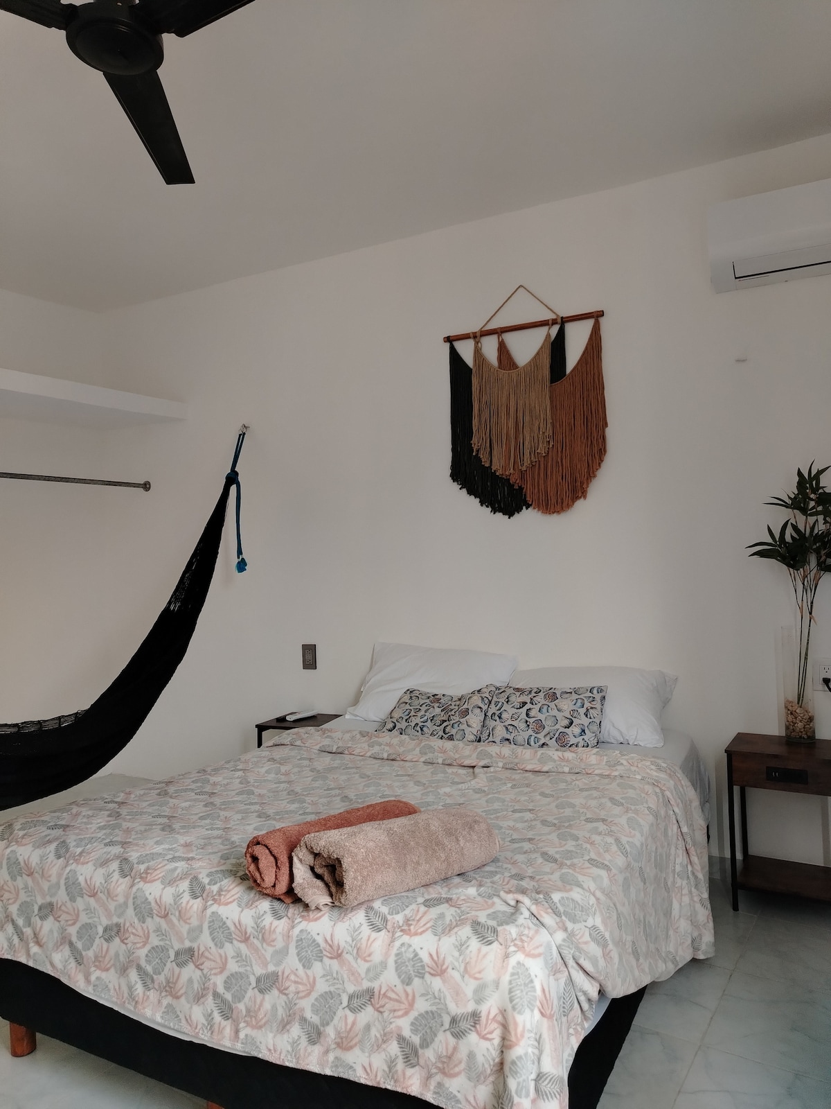 Es un alojamiento completo con alberca privada. Propiedad ubicada a unos pasos de la famosa calle 59, llena de cafés, restaurantes y bares. La decoración es colonial, la sala con sofá, tv de 50" con Netflix, Wi Fi, comedor para 6 personas, cocina con estufa de inducción magnética , refrigerador, horno de microhondas, 1 dormitorio con cama king size, TV de 32”, 1 aire acondicionado, ropero, baño con agua caliente y terraza con alberca. El Aire acondicionado solo hay en la habitación .