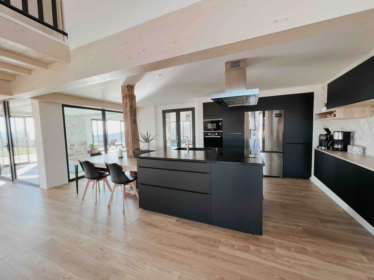 🌾Un nido de tranquilidad, en el corazón del campo🌾 Esta casa de campo de 320 m² ha sido diseñada para combinar comodidad, espacio y amabilidad. Incluye 4 suites para padres, un dormitorio, una sala de estar luminosa, un gran comedor y una cocina equipada. Piscina interior, jacuzzi con vistas, billar, bolera: todo está reunido para relajarse y compartir buenos momentos. Ideal para estancias familiares, con amigos o para acoger seminarios y retiros en un entorno tranquilo.