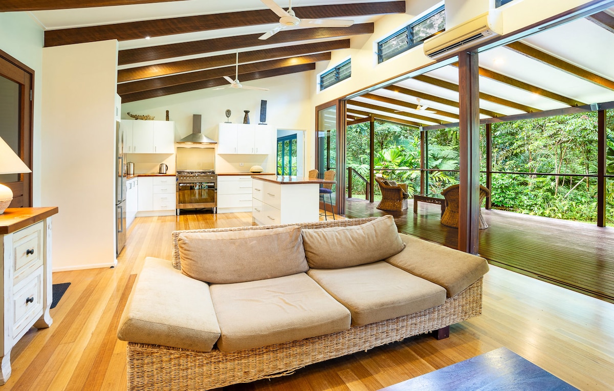 ¡Oferta de bienvenida de nuevo! ¡10 % de descuento para las reservaciones de abril! ¡Vistas increíbles! - Flametrees sobre el Daintree Con posiblemente una de las mejores vistas del Daintree, sumérgete en la naturaleza mientras te relajas en la espaciosa terraza con vistas al bosque tropical Daintree con fabulosas vistas de Wundu - Thornton Peak. Esta casa de ladrillo en una colina ofrece una estancia cómoda en un entorno tranquilo. Ten en cuenta que no hay aire acondicionado, la refrigeración solo se proporciona a través de ventiladores y persianas opacas.