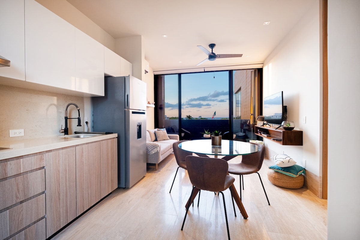Bienvenido a nuestro impresionante apartamento de lujo de 2 habitaciones, ubicado en el corazón de Cozumel. Con dos hermosas terrazas, este apartamento le brinda el lugar perfecto para disfrutar de la tranquilidad de la isla. Tan pronto como pase por la puerta, se encontrará con una amplia y moderna sala de estar, bellamente decorada con elegantes muebles y una gran cantidad de luz natural. La sala de estar está equipada con una gran pantalla plana de televisión y un comedor para cuatro personas