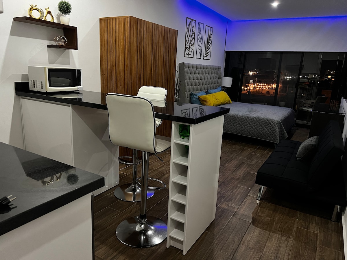 Hermoso departamento con alberca o piscina para tener un lugar de descanso cómodo y está abierta hasta las 10 pm, elevador, vigilancia, cámaras seguridad en el estacionamiento, contamos con (Wifi de alta velocidad de 60 mbps) para las personas que trabajan desde casa, Colchón nuevo, una cama queen y un sofá cama individual, sartén nuevo, Apartamento tipo Loft a 8 min en carro de la quinta avenida, silencioso, cocina de granito, aire acondicionado , balcón y 🏊♀️alberca