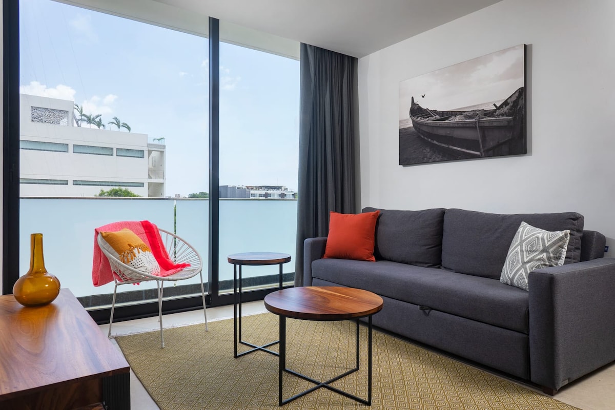 Perfecto para disfrutar de la más agradable estadía en Playa del Carmen! Cerca de las mejores playas, de la 5ta avenida, restaurantes y tiendas, pero lejos del ruido de la noche. El departamento tiene todas las comodidades que puedas necesitar, y esta ubicada en un bello condominio nuevo, un edificio moderno que cuenta con rooftop con piscina y gimnasio y con una ubicación inmejorable!