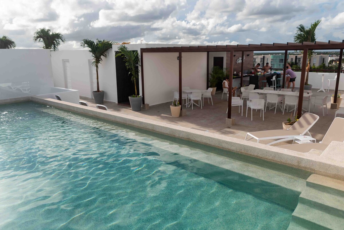 Este lugar tiene una ubicación estratégica en el corazón de Playa del Carmen: A 4 cuadras de la famosa Quinta Avenida, tan cerca a la playa que podrás ir caminando y a tan solo una cuadra de un super mercado. Es una zona muy segura donde encontrarás restaurantes y todo tipo de servicios a solo unos pasos. Cuenta con una hermosa piscina en el roof con vista al Mar Caribe, gym y área para asados en la zona común del edificio. A/A, cocina, televisión y wifi dentro del departamento.