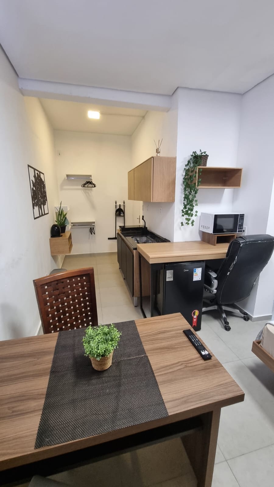 Un departamento práctico con un espacio súper adecuado para la oficina en casa, que incluye cerrar la cama para dar más espacio - 23m² - Balcón. - Cocina con microondas, fogao, microondas, figrobar y utensilios; - Televisión 55 ambilight - Internet - almohada, sábanas incluidas - Fácil acceso a la calle, muy privado. Mensual: agua incluida, luz, internet y sábanas y sábanas limpias semanalmente, opción de limpieza semanal R$ 400,00 por mes