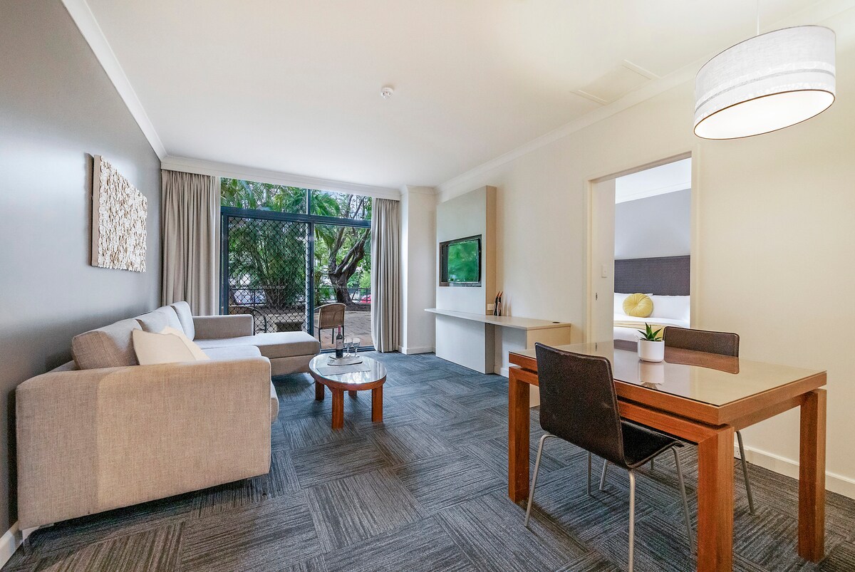 ¡Te damos la bienvenida a tu retiro urbano en el corazón de Darwin! Este moderno apartamento de un dormitorio ofrece unas vistas inmejorables del horizonte de la ciudad y más allá. Disfruta de una cama tamaño king relajante, internet rápido y un nuevo sistema de aire acondicionado. La cocina totalmente equipada incluye una cafetera, mientras que el elegante baño cuenta con bañera. El edificio ofrece estacionamiento seguro, gimnasio, piscina y un sencillo proceso de autorregistro después de las 3 p. m.