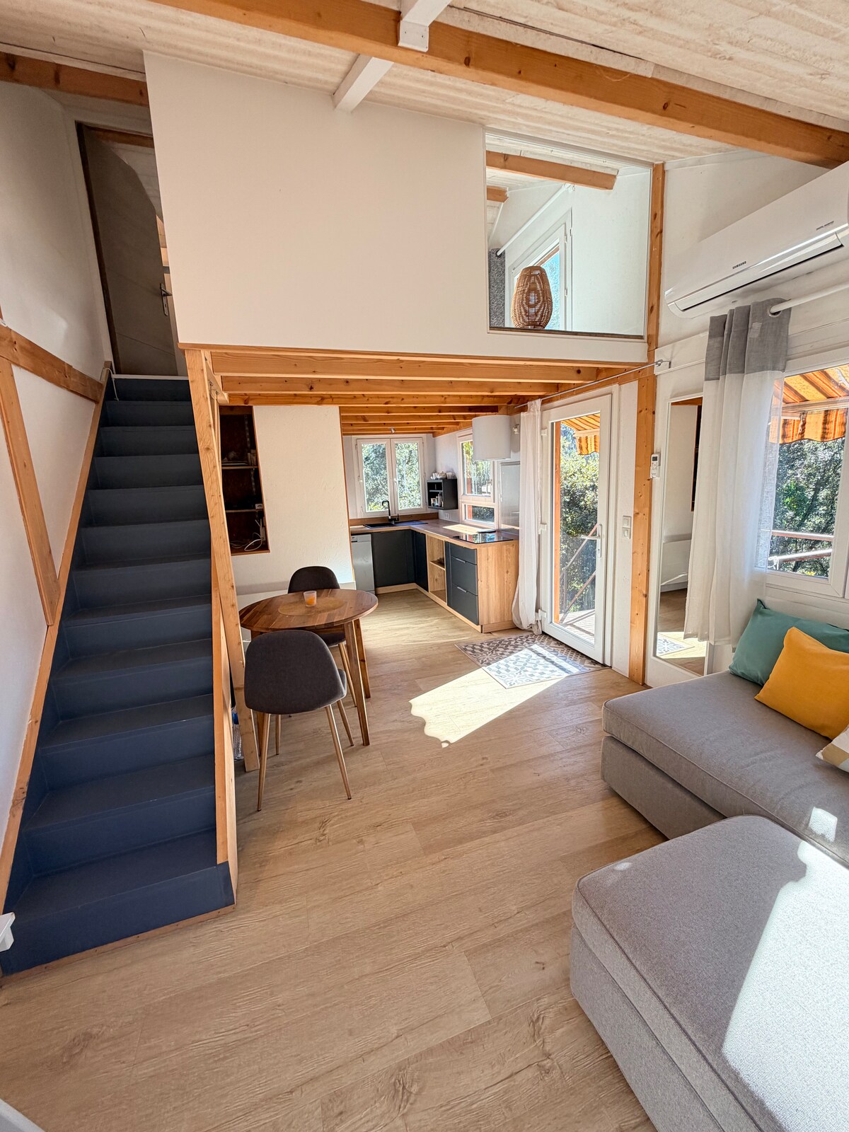 Chalet de vacaciones de 20 m2 tranquilo que incluye una gran sala de estar con cocina abierta totalmente equipada, aire acondicionado, baño y televisión. Terraza sombreada, muebles de jardín con vistas a la vegetación. Acceso directo en carretera a través de una puerta. Fácil estacionamiento cerca de la cabaña.