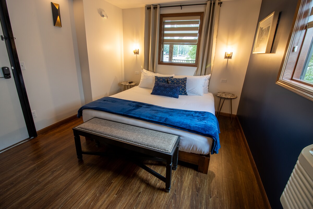 This luxury modern hotel sets the stage for a memorable trip. Situated amongst the pine tree canopy and on the top level of our main lobby building, featuring large open patios overlooking the entire resort, and event center. Accommodations include one king-sized bed, desk, large soaking tub, and a refrigerator and microwave. Gather and make yourself at home in our spacious lobby. Steps away from the Paul Bunyan Trail, allowing easy access to Downtown Nisswa! *Accessible only by stairs.